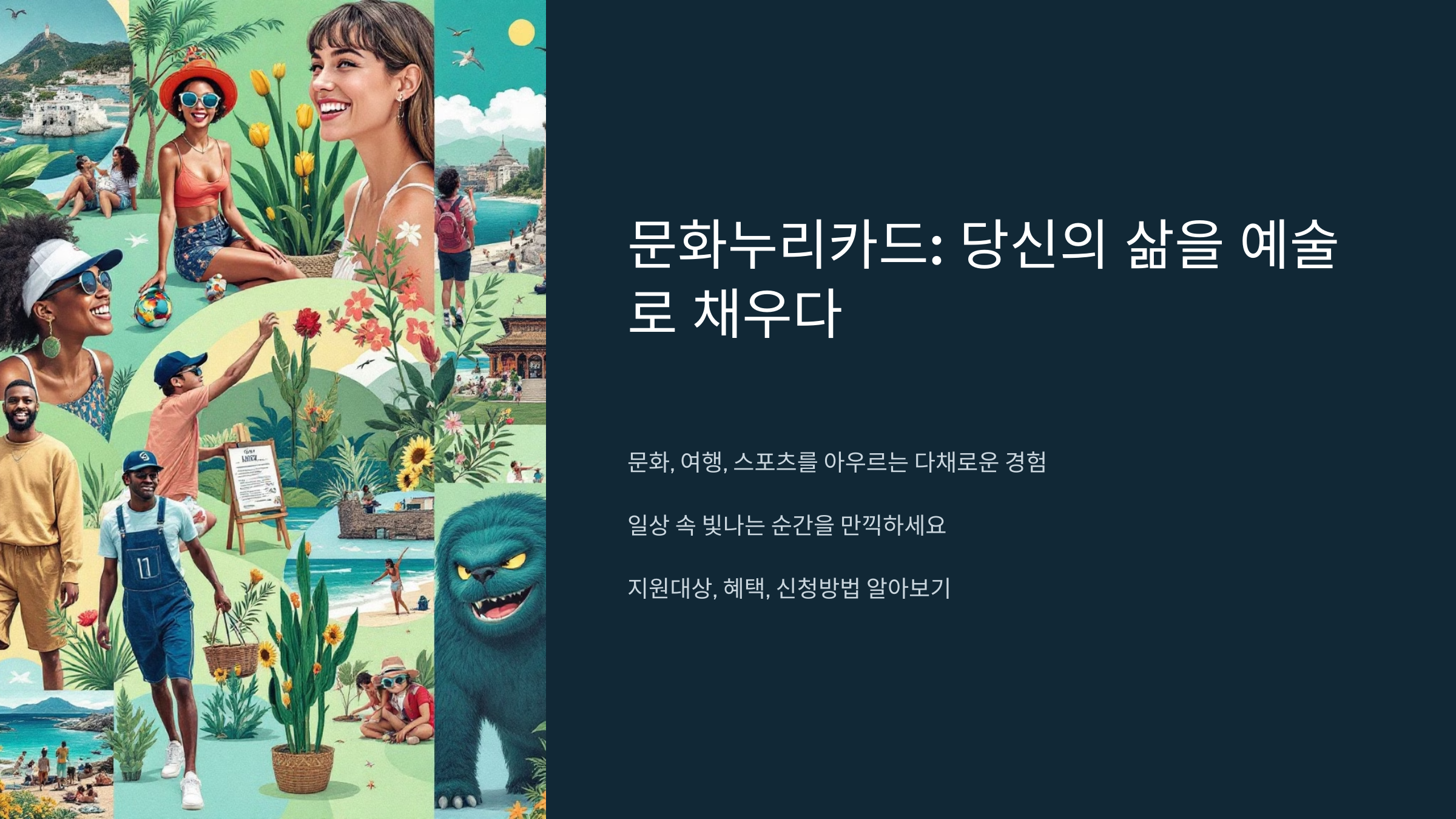 문화누리카드는 평범한 일상을 특별하게 만드는 품격 있는 문화의 시작입니다. 예술, 여행, 스포츠를 아우르는 다채로운 경험을 통해, 삶의 깊이와 아름다움을 새롭게 발견할 수 있습니다. 이 작은 카드 한 장이 당신에게 열어줄 새로운 세상, 이제 일상 속에서 빛나는 순간을 만끽하세요. 문화누리카드와 함께, 당신의 이야기에 예술적 영감을 더해보세요. 오늘은 문화누리카드 지원대상, 지원혜택, 지원방법에 대해 알아보도록 하겠습니다.