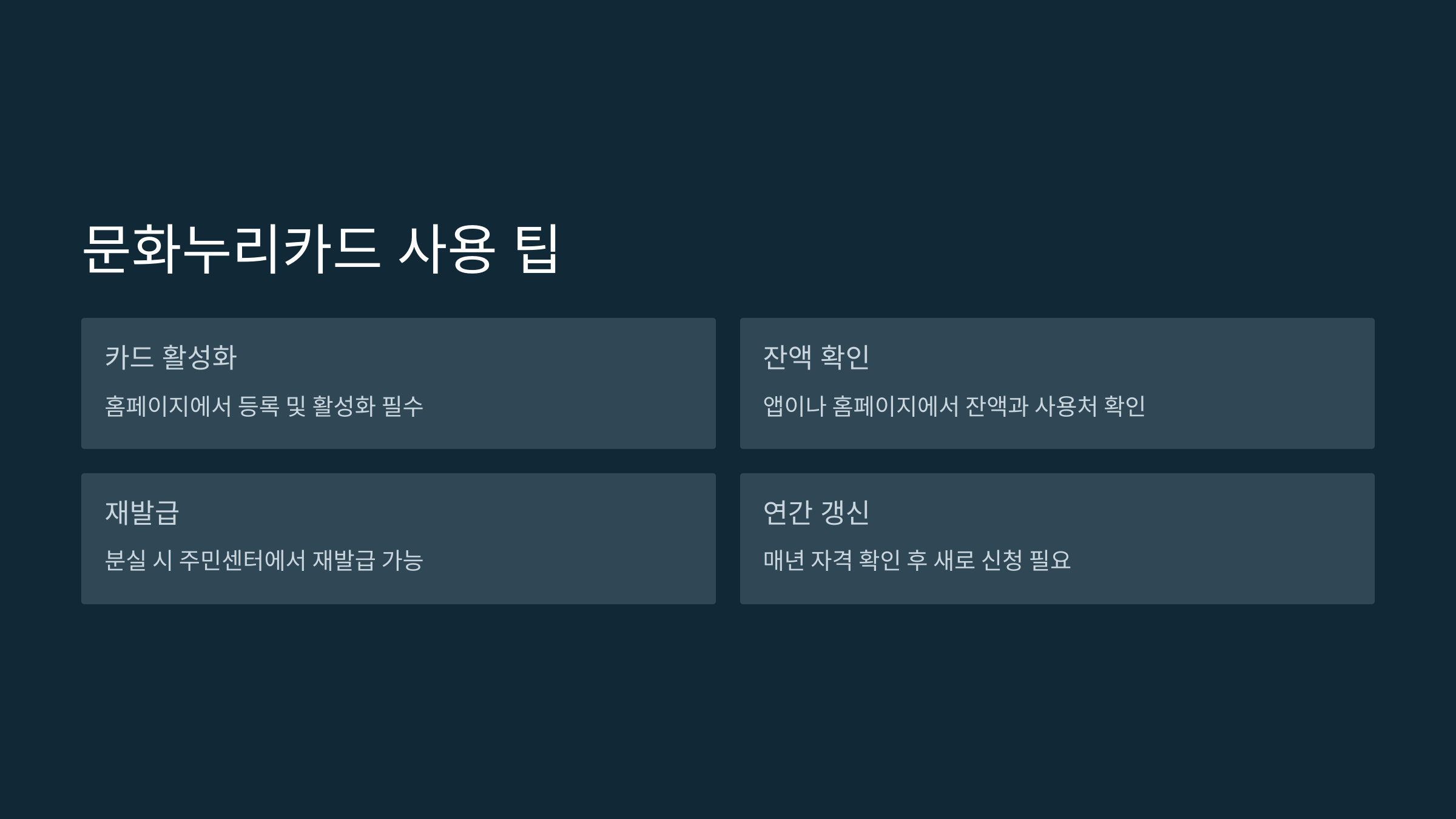 - 카드 잔액과 사용처는 문화누리카드 앱이나 홈페이지에서 확인 가능.