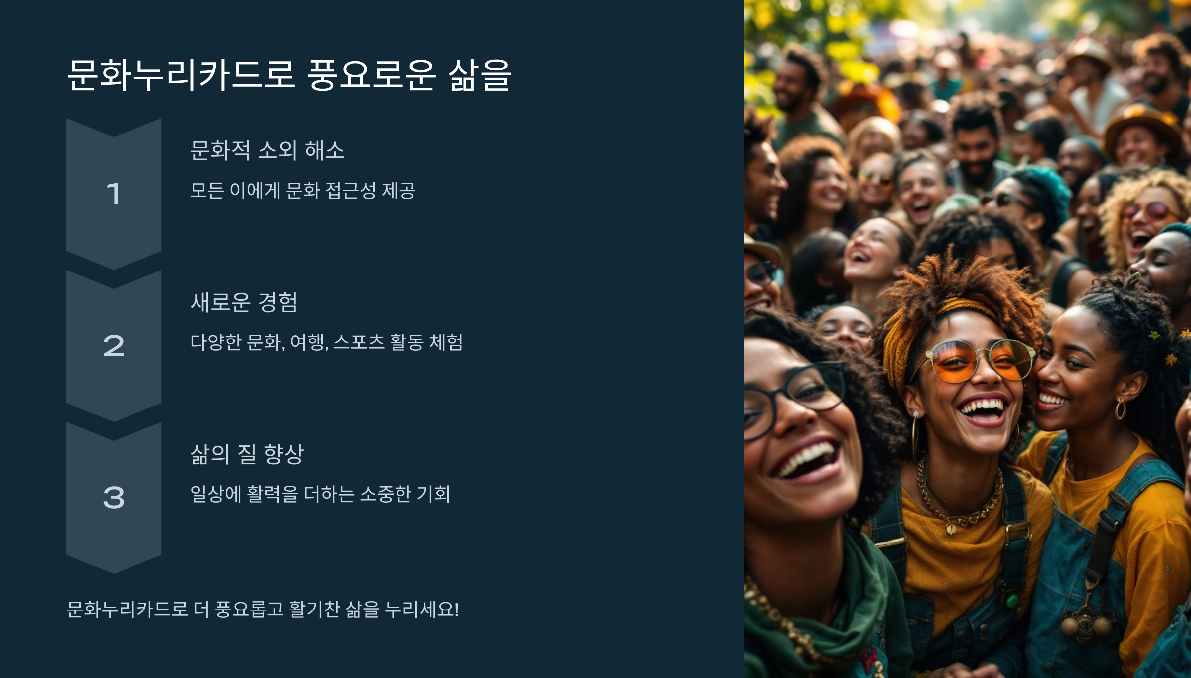 문화누리카드는 단순한 금전적 지원을 넘어 문화적 소외를 해소하고, 삶에 활력을 더하는 소중한 제도입니다. 지원 대상자라면 꼭 신청하여 영화, 공연, 스포츠, 여행 등 다양한 혜택을 누리며 새로운 경험을 만끽해 보세요. 정부의 도움으로 더 풍요로운 삶을 누리는 계기가 되기를 바랍니다! 😊