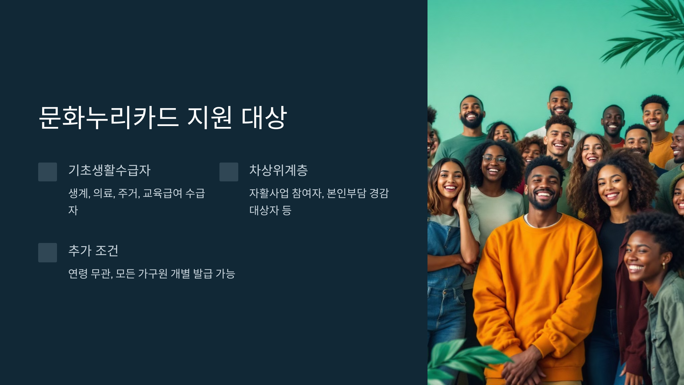 문화누리카드는 정부에서 정한 소득 기준에 따라 기초생활수급자와 법정 차상위계층을 대상으로 제공됩니다. 아래는 자세한 지원 대상 세부 기준입니다.