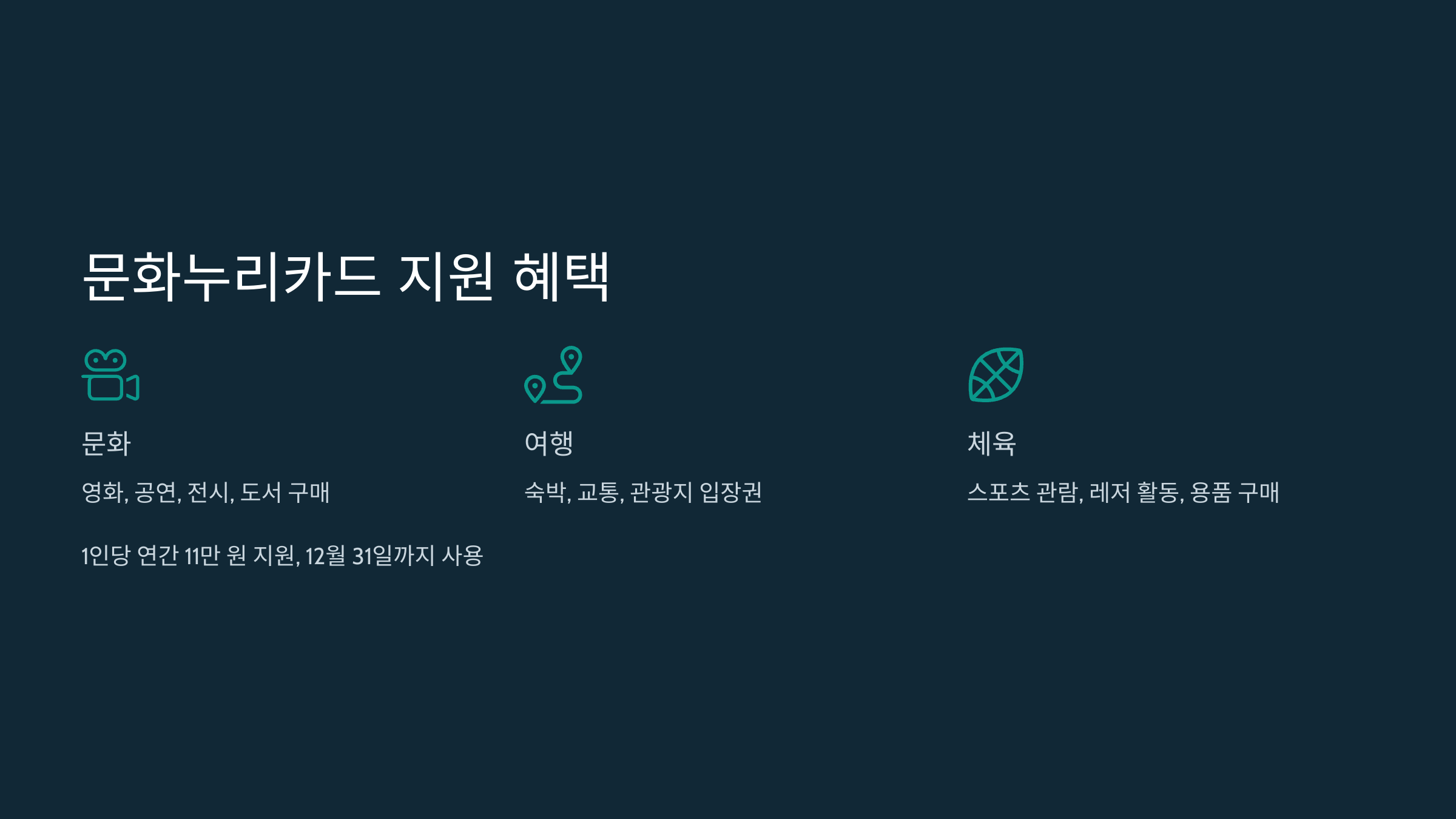 이 카드는 단순히 금전적 지원을 넘어, 모든 국민이 문화 활동에 동등하게 접근할 수 있는 기회를 제공합니다. 다양한 문화 활동과 체육, 여행을 통해 삶의 활력을 얻고, 사회적 격차를 줄이는 데 기여하는 것이 이 제도의 핵심입니다.