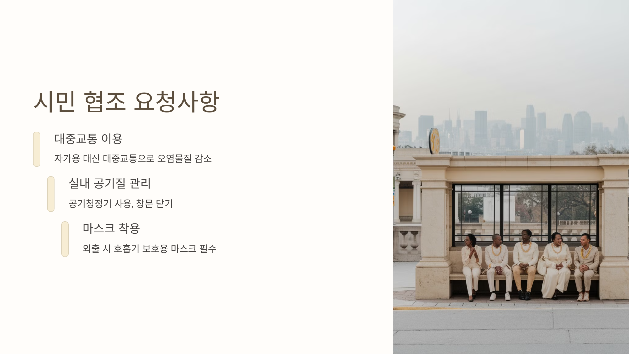 | Q5: 시민들이 협조해야 하는 사항은 무엇인가요? | 시민들은 대중교통 이용, 실내 공기질 관리, 마스크 착용 등을 통해 미세먼지 농도를 낮추고, 자신의 건강을 보호할 수 있습니다. |