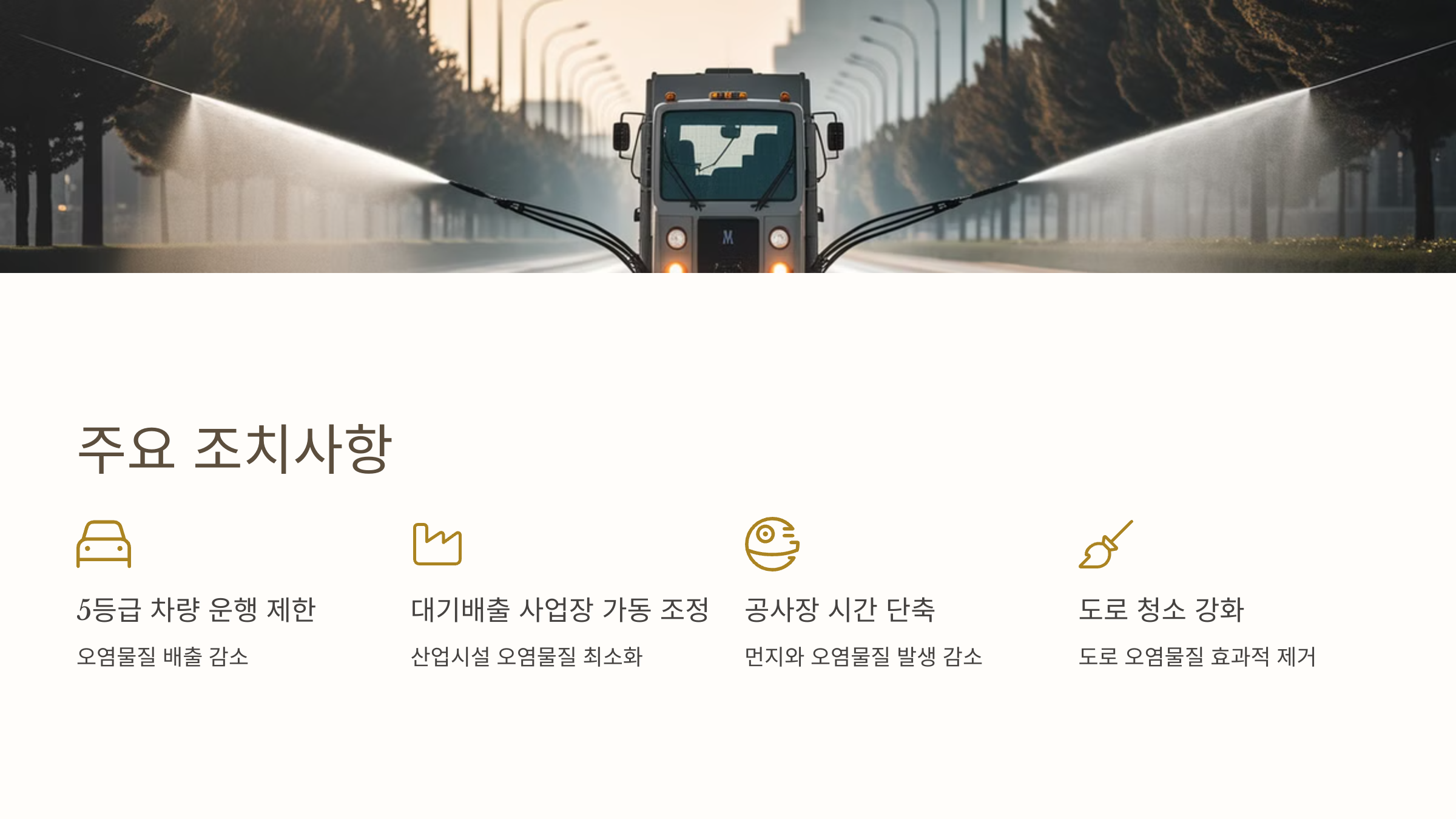 도로에서 발생하는 오염물질과 먼지를 효과적으로 제거하기 위해, 주요 도로와 일반도로의 청소 작업을 강화합니다.