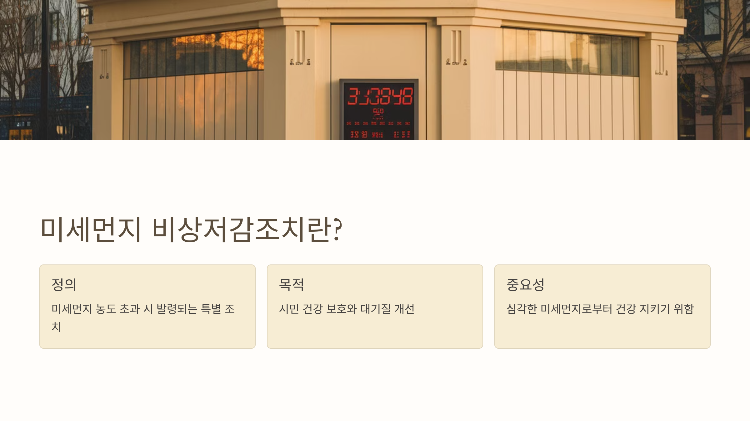 | Q1: 미세먼지 비상저감조치는 무엇인가요? | 미세먼지 비상저감조치는 대기 중 미세먼지 농도가 위험 수준에 도달했을 때, 건강을 보호하고 대기질을 개선하기 위해 시행되는 특별한 조치입니다. |