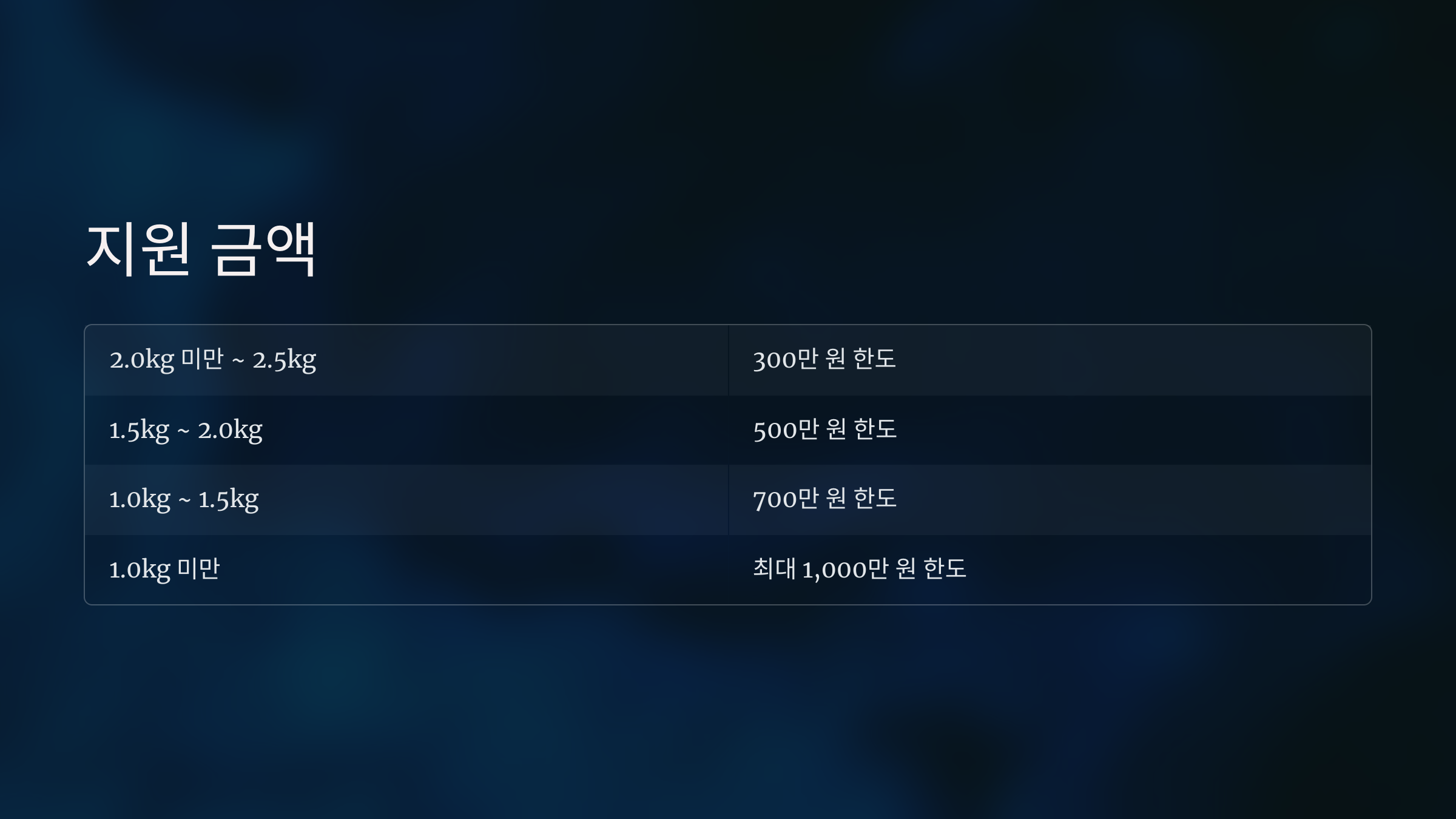 - 2.0kg 미만 ~ 2.5kg: 300만 원 한도
