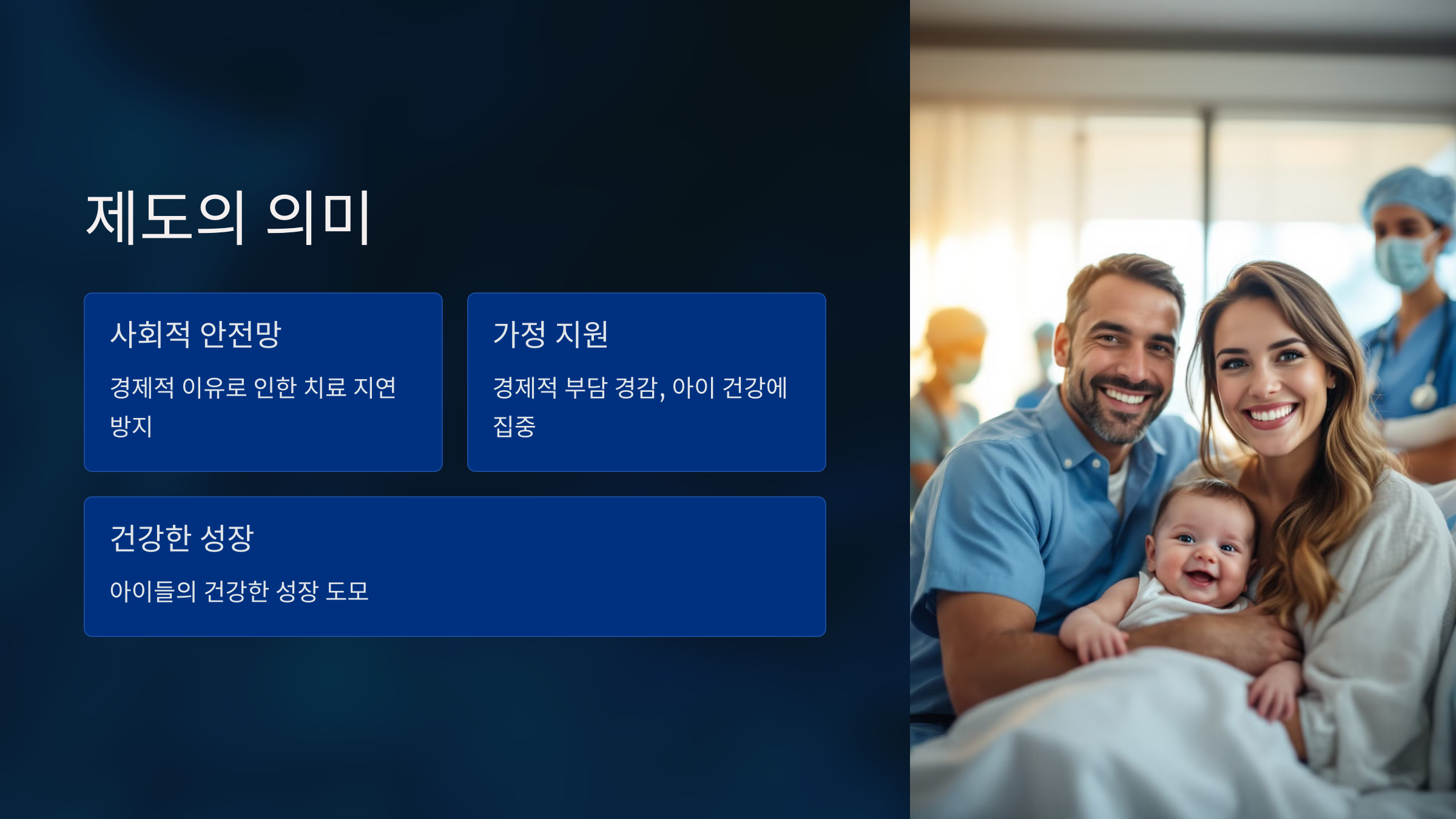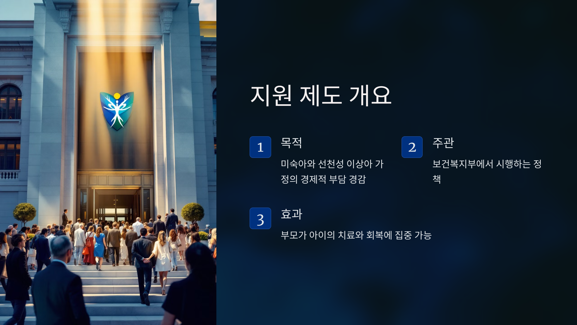 이 제도는 경제적 이유로 인해 치료가 미뤄지거나, 건강 회복이 지연되는 상황을 막기 위한 중요한 사회적 안전망입니다. 이를 통해 많은 가정이 경제적 부담을 덜고 아이의 건강에 집중할 수 있게 되며, 나아가 건강한 성장을 돕는 효과적인 제도라 할 수 있습니다.