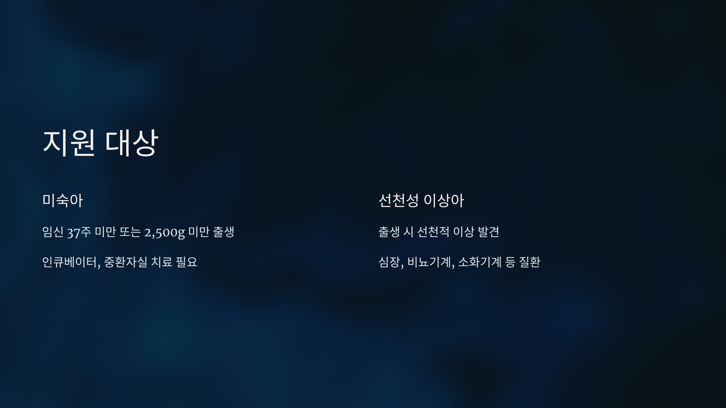 지원 대상 : 미숙아 및 선청성 이상아 의료비 지원