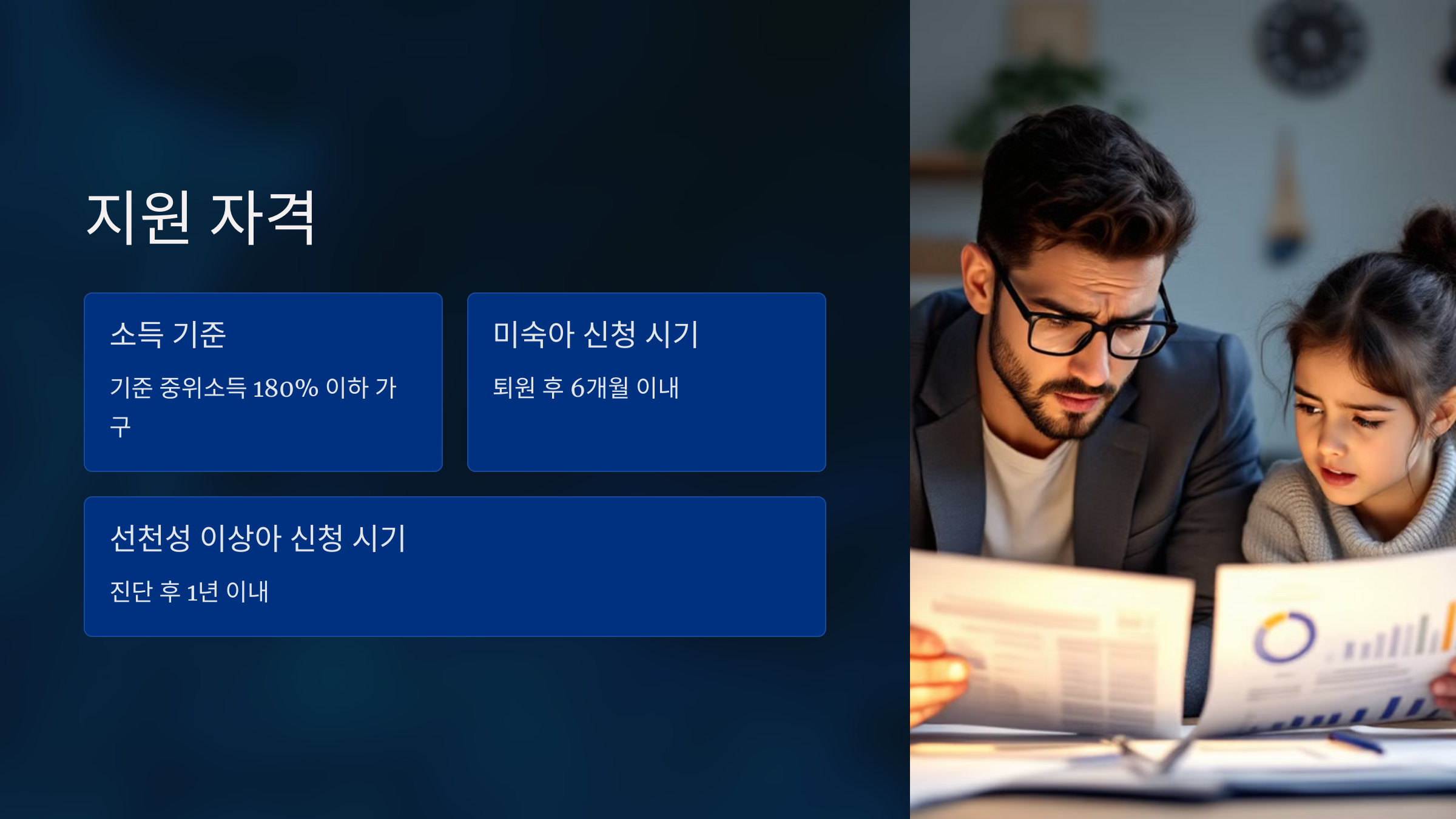 - 미숙아는 퇴원 후 6개월 이내에, 선천성 이상아는 진단 후 1년 이내에 신청해야 합니다.