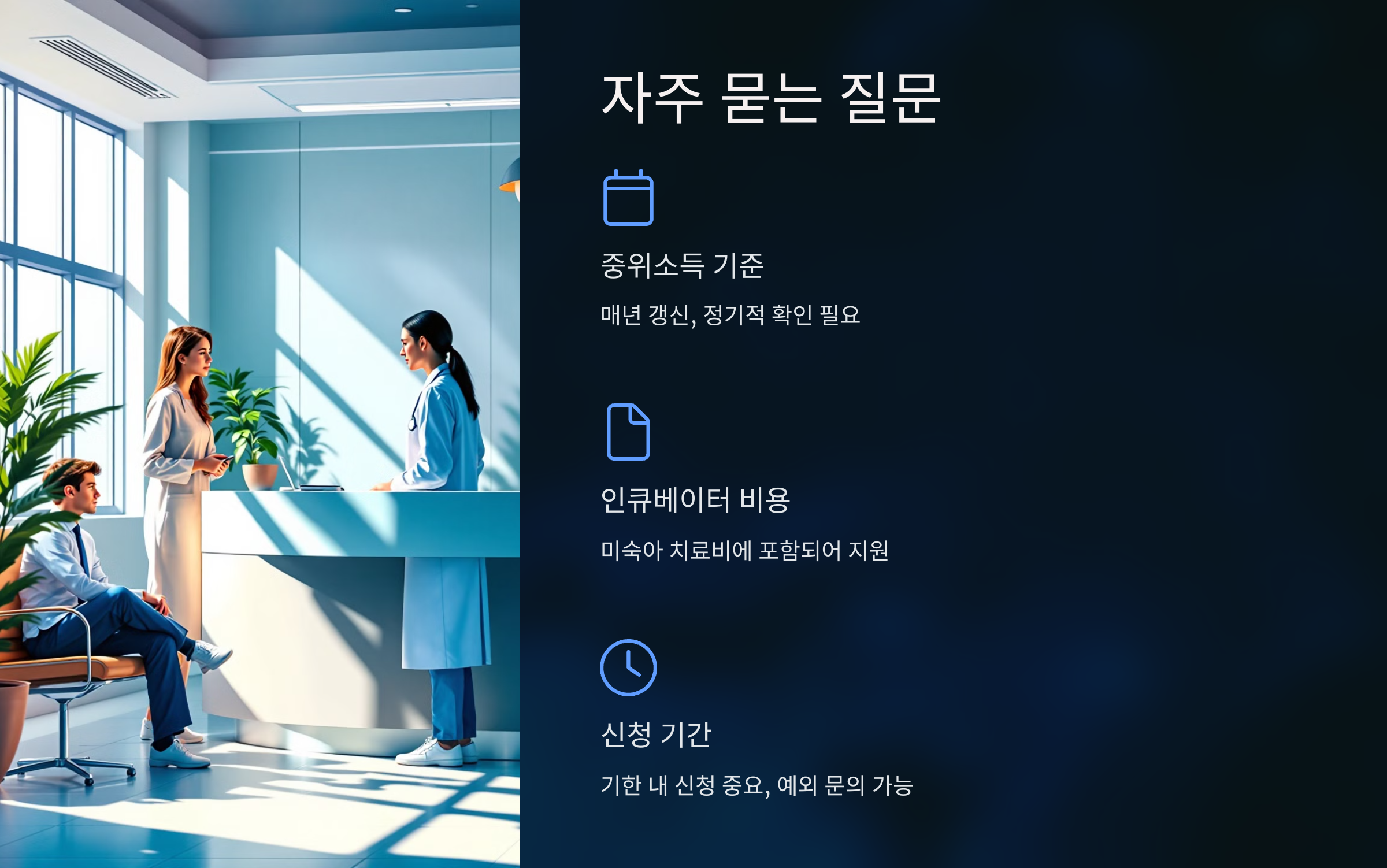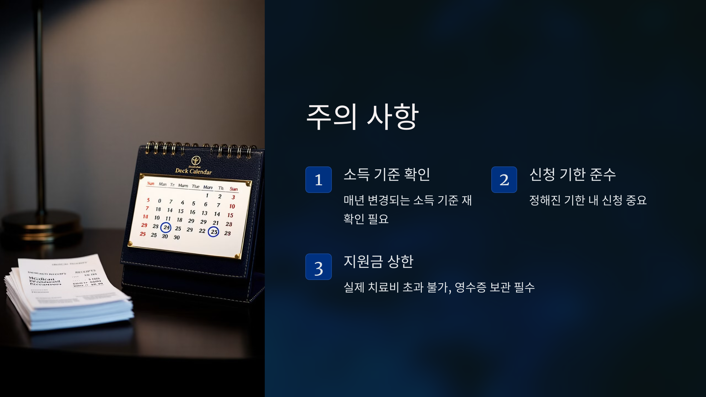 - 의료비 영수증 및 병원비 청구서도 필수 서류로 제출해야 하며, 해당 서류가 준비되어 있어야 지원 신청이 원활하게 진행됩니다.