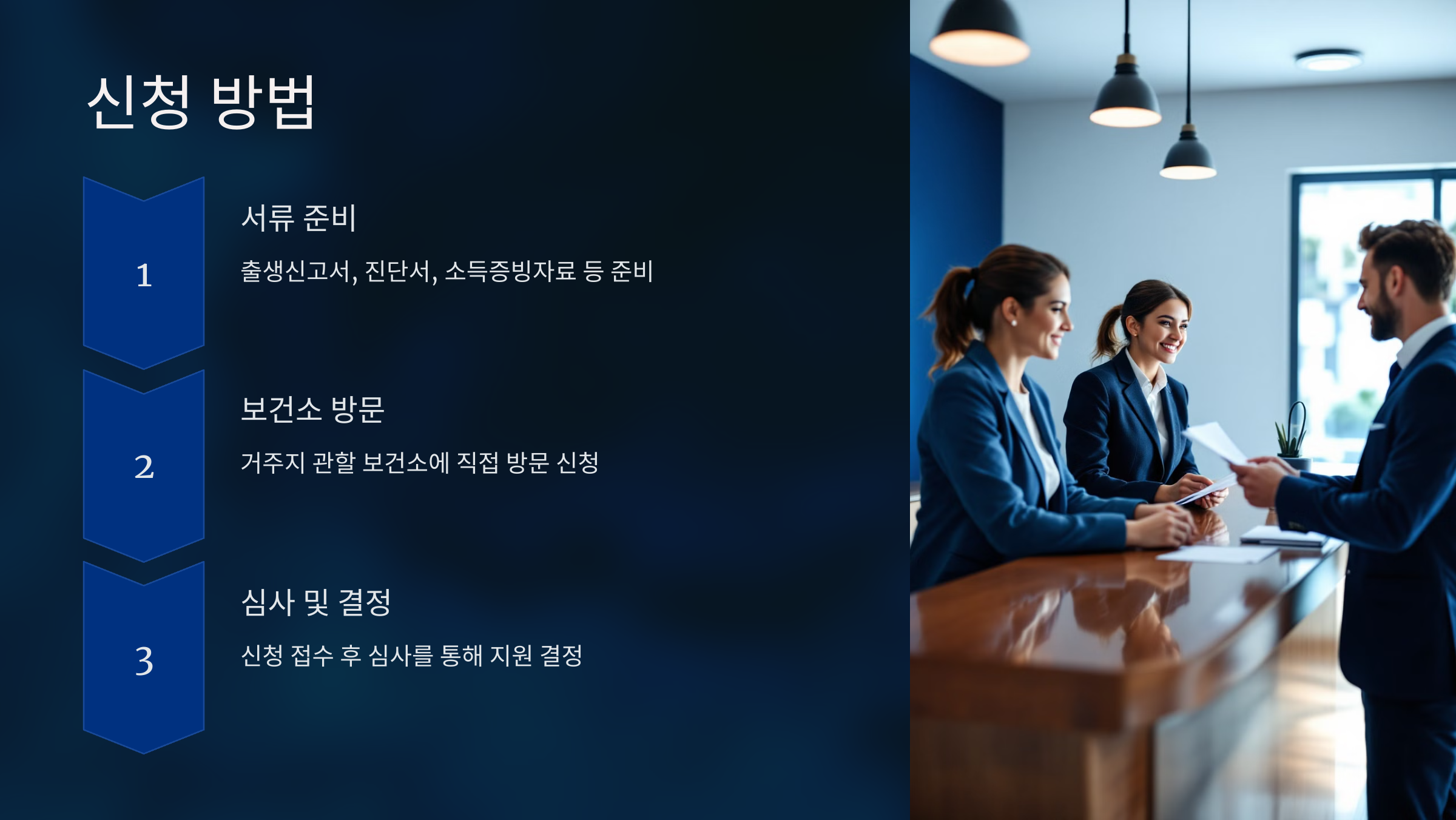 - 출생 신고서, 병원 진단서, 가족 관계 증명서, 소득 증빙 자료 등을 준비해야 합니다.