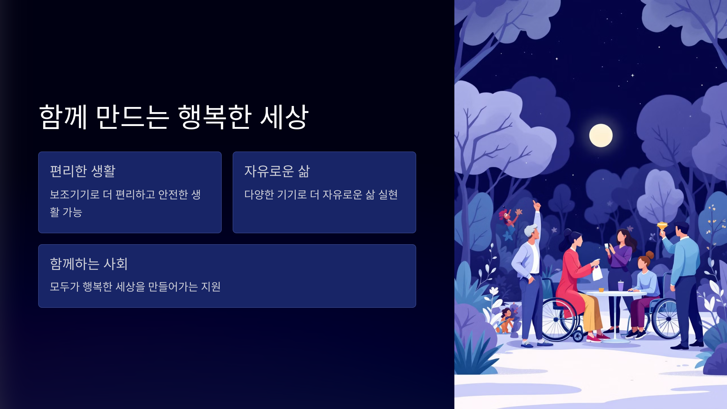 보조공학기기지원은 장애가 있는 사람들이 더 편리하고 안전하게 생활할 수 있도록 중요한 도움을 줍니다. 다양한 기기를 통해 더 많은 사람들이 행복하고 자유로운 생활을 할 수 있기를 응원해요. 이 지원을 통해 서로가 함께 행복한 세상을 만들어가요!