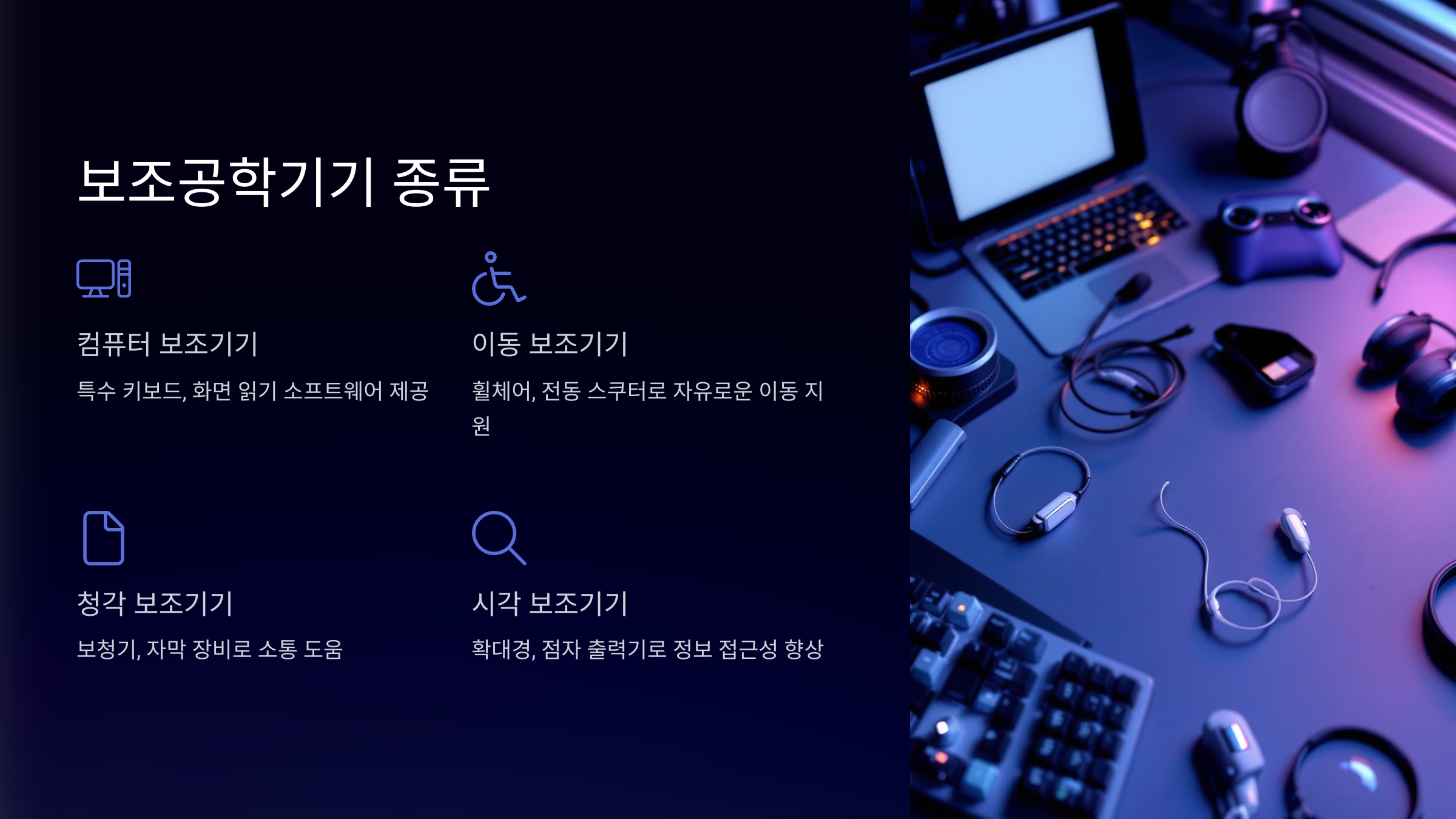 걷기나 이동에 어려움이 있는 사람들을 위한 도구들도 지원됩니다. 휠체어나 전동 스쿠터와 같은 기기들이 이에 해당돼요. 이 기기들을 사용하면 학교나 집 주변을 자유롭게 다닐 수 있어요. - 청각 보조기기
