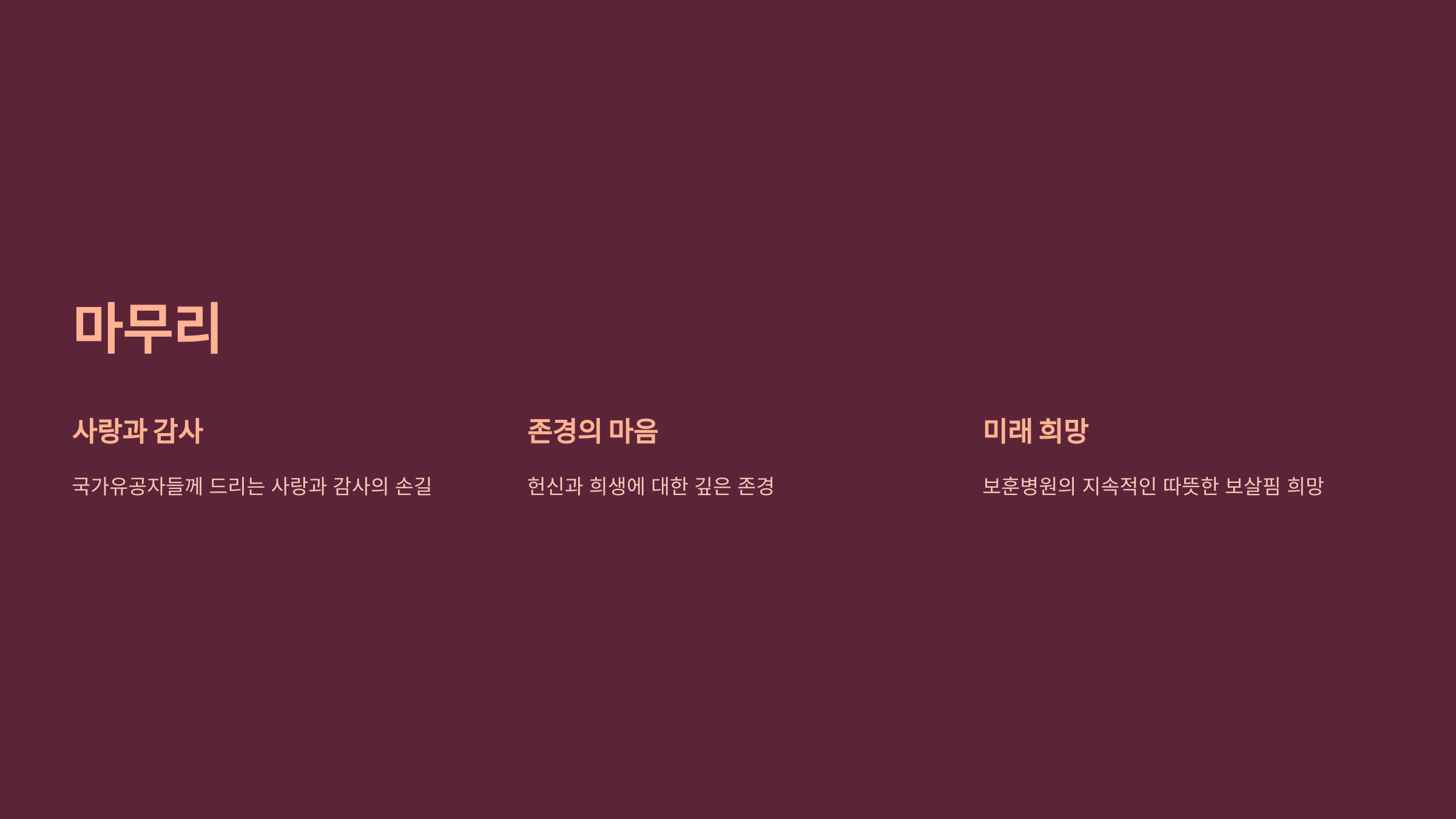 보훈병원 진료는 국가유공자들께 드리는 사랑과 감사의 손길입니다. 헌신과 희생에 대한 깊은 존경을 담아 이분들의 건강과 행복을 지켜드리기를 소망합니다. 앞으로도 보훈병원이 국가유공자와 가족분들의 건강한 삶을 위해 따뜻한 보살핌을 이어가기를 바랍니다.