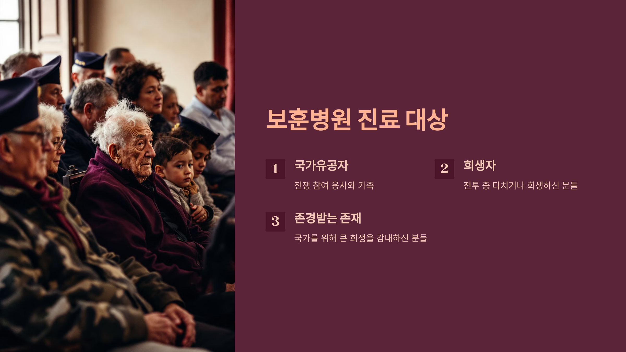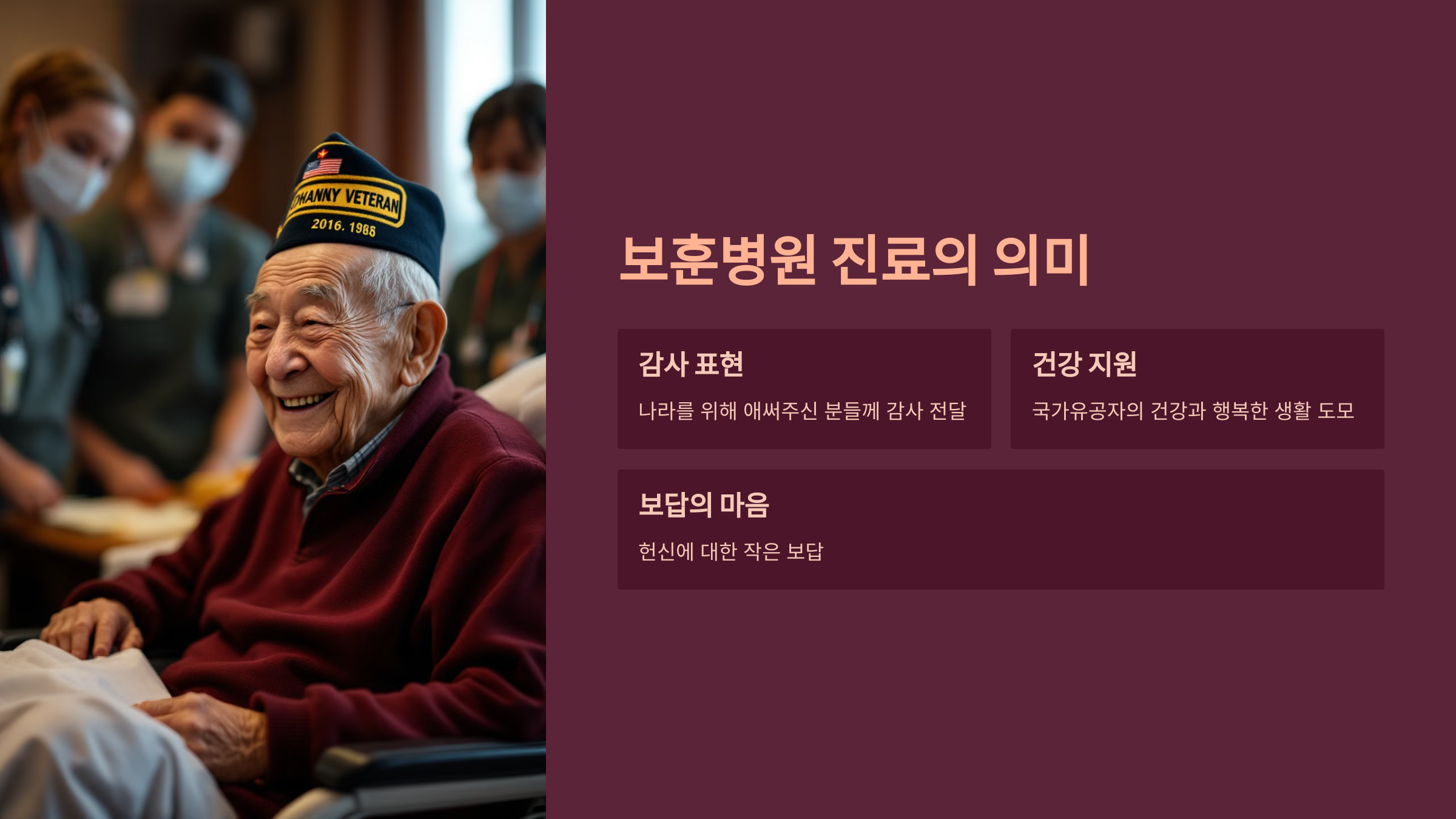 보훈병원 진료는 국가유공자와 그 가족분들을 위한 제도입니다. 전쟁에 참여하여 나라를 지켜주신 용사들, 그 가족들, 그리고 전투 중 다치거나 희생하신 분들을 위해 마련되었습니다. 나라를 위해 큰 희생을 감내하신 이분들이 국가유공자로서 당연히 존경받아야 할 존재임을 기억하고, 편안하게 진료를 받으실 수 있도록 돕고 있습니다.