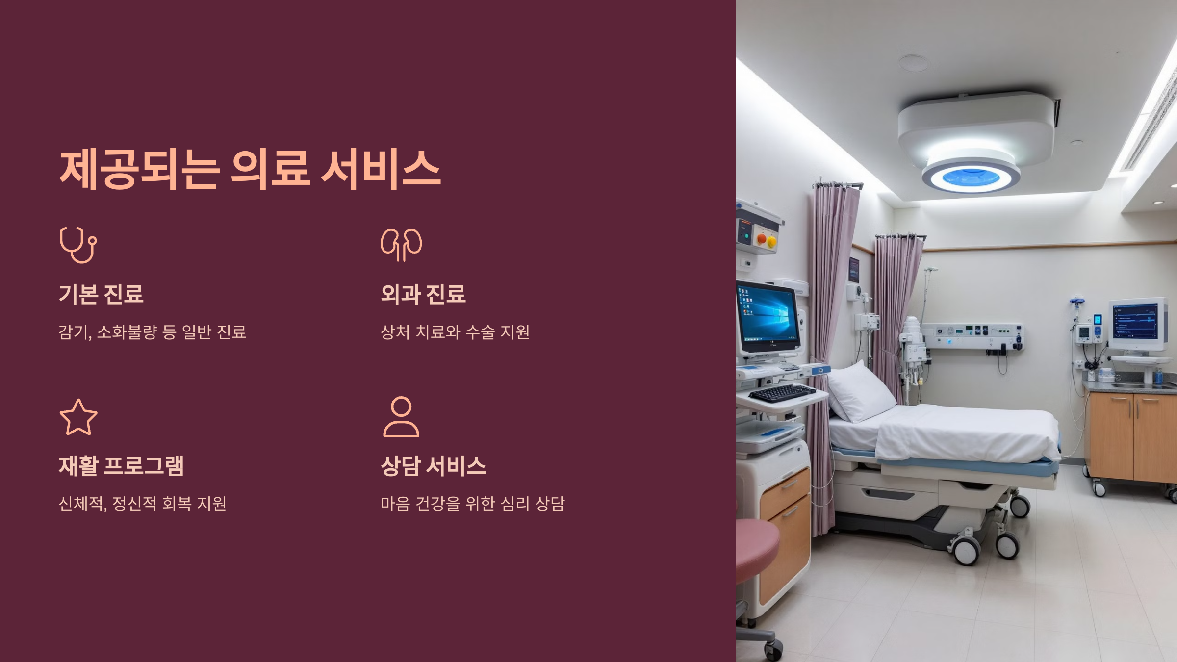 보훈병원 진료는 다양한 건강 관리 서비스를 제공합니다. 감기나 소화불량 같은 기본적인 진료뿐만 아니라, 상처 치료와 수술을 돕는 외과 진료도 가능합니다. 특히 전투 중 다치신 분들을 위한 재활 프로그램도 운영되며, 신체적으로나 정신적으로 힘든 시간을 겪은 분들이 건강을 회복할 수 있도록 돕고 있습니다.
