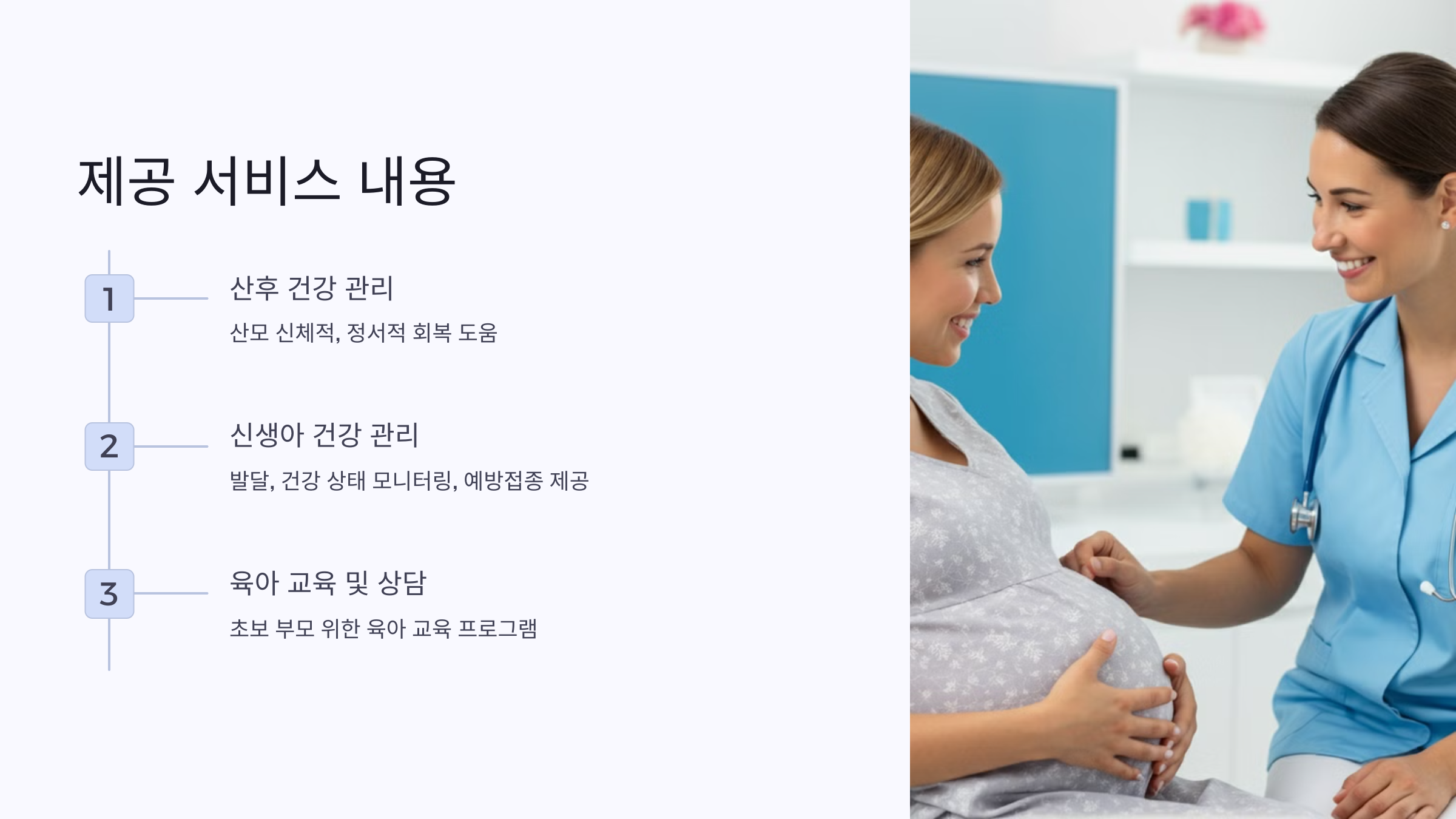 출산 후 산모의 신체적, 정서적 회복을 돕기 위한 서비스를 제공합니다. 전문 간호사나 상담사와의 1:1 상담을 통해 산모의 건강 상태를 점검하고, 필요한 경우 의료 지원을 받을 수 있도록 연결해 줍니다. 또한, 정신적인 안정과 스트레스 관리를 위한 프로그램도 마련되어 있어, 산모가 자신의 건강을 잘 돌볼 수 있도록 돕습니다. - 신생아 건강 관리 서비스