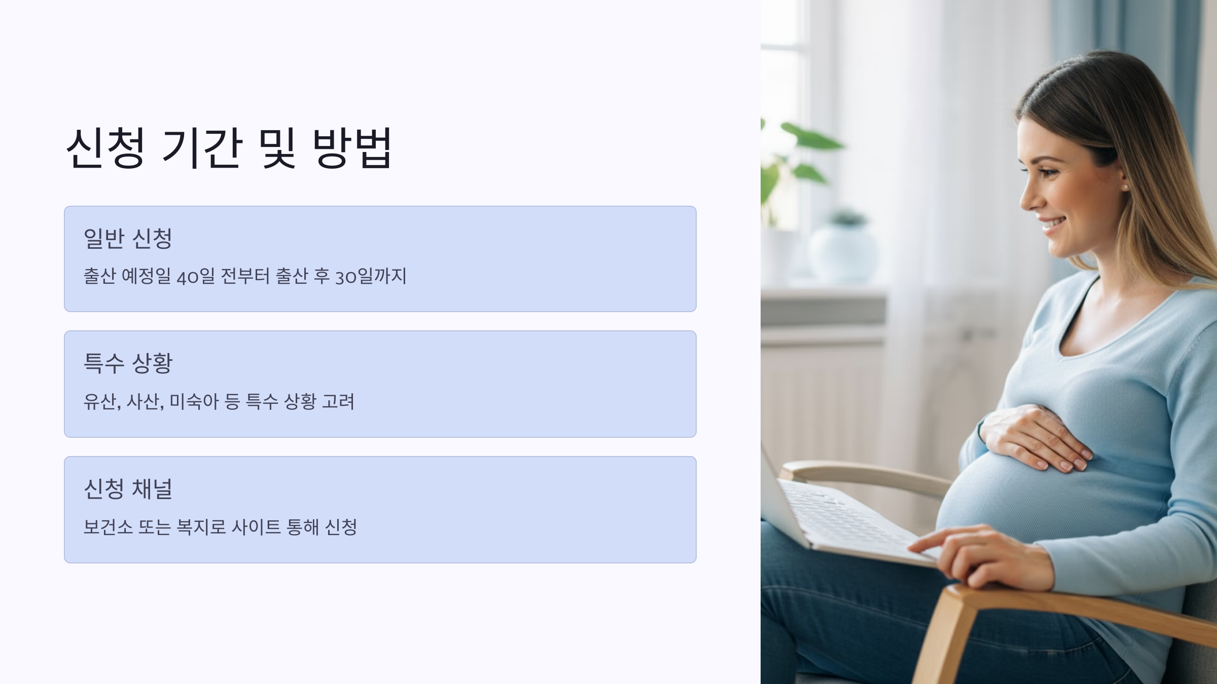 신청 방법을 좀 더 자세히 알려드리면 출산 예정일 40일 전부터 출산일로 부터 30일까지 보건소 또는 복지로 사이트(www.bokjiro.go.kr) 를 통해 신청하시면 됩니다. 그리고 인터넷 신청일 경우 신청불가능한 경우가 있어 확인을 꼭 해 주시기 바랍니다. 임신 16주이상 발생한 유산사산의 경우 확인일로 부터 30일 이내, 미숙아, 선천성 이상아 출산 등으로 입원한 경우 신생아 퇴원일로 부터 30일이내 신청하셔야 합니다.