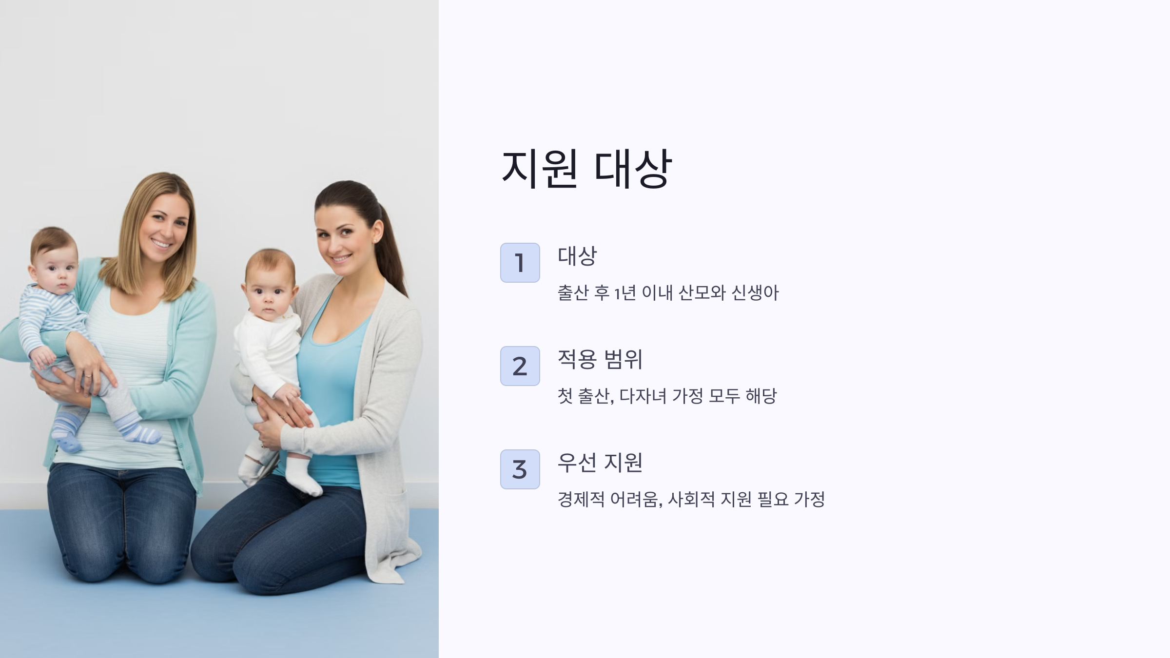 즉, 출산한 지 1년이 지나지 않은 모든 엄마와 그들의 아기가 지원을 받을 수 있습니다. 이는 첫 출산 뿐 아니라 다자녀 가정의 경우에도 동일하게 적용되며, 경제적 여건이나 거주지와 상관없이 누구나 이 사업의 혜택을 받을 수 있습니다. 또한, 경제적으로 어려운 가정이나 사회적 지원이 필요한 산모들에게는 우선적으로 지원이 이루어집니다.