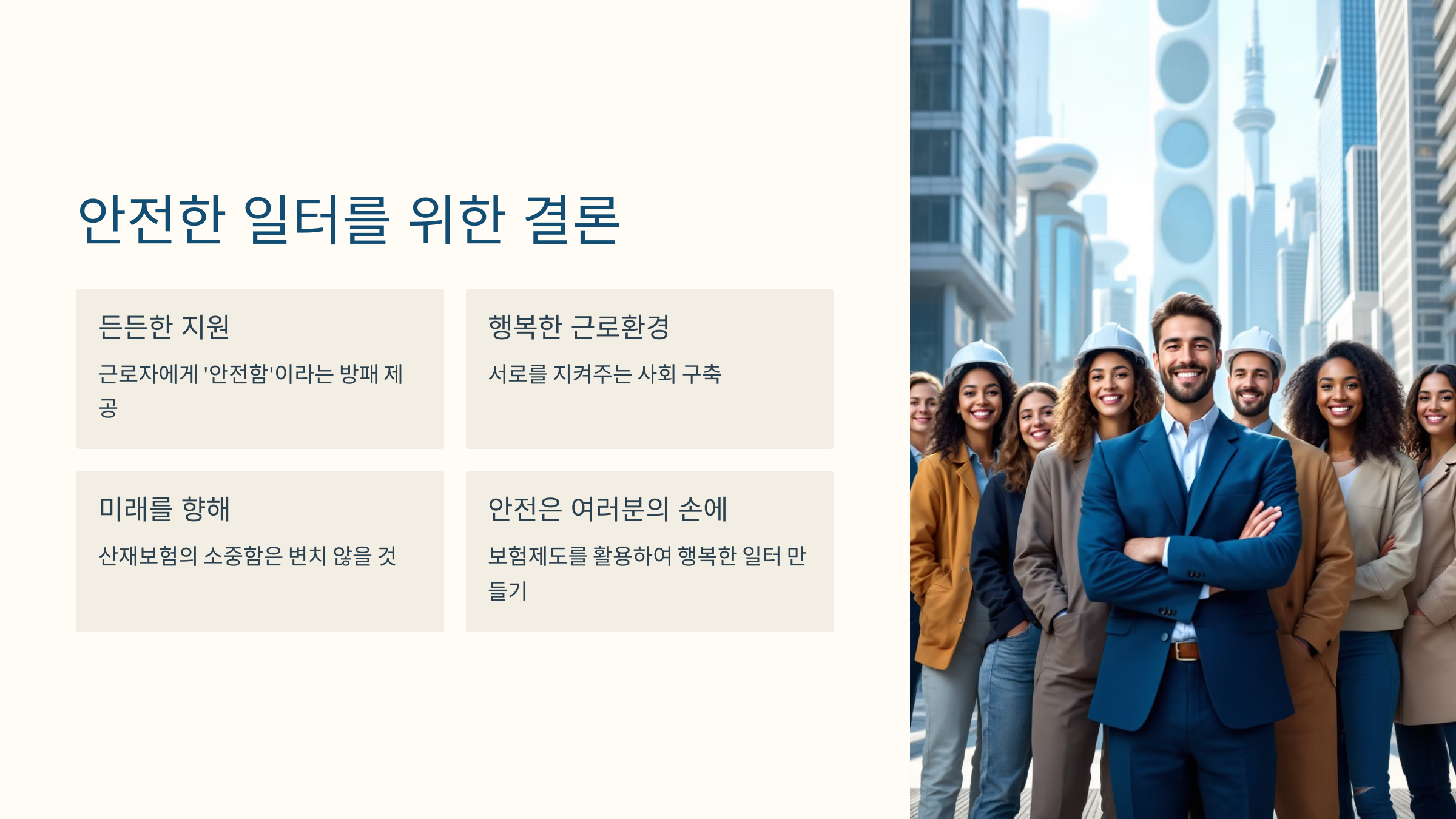 세상은 계속 변하고, 우리는 함께 성장해 나갑니다. 그럼에도 불구하고 산재보험의 소중함은 변치 않을 것입니다. 모든 근로자와 가족들이 행복하게 일할 수 있도록, 보험제도를 활용해보세요. 안전은 결국 여러분의 손에 달려 있습니다!