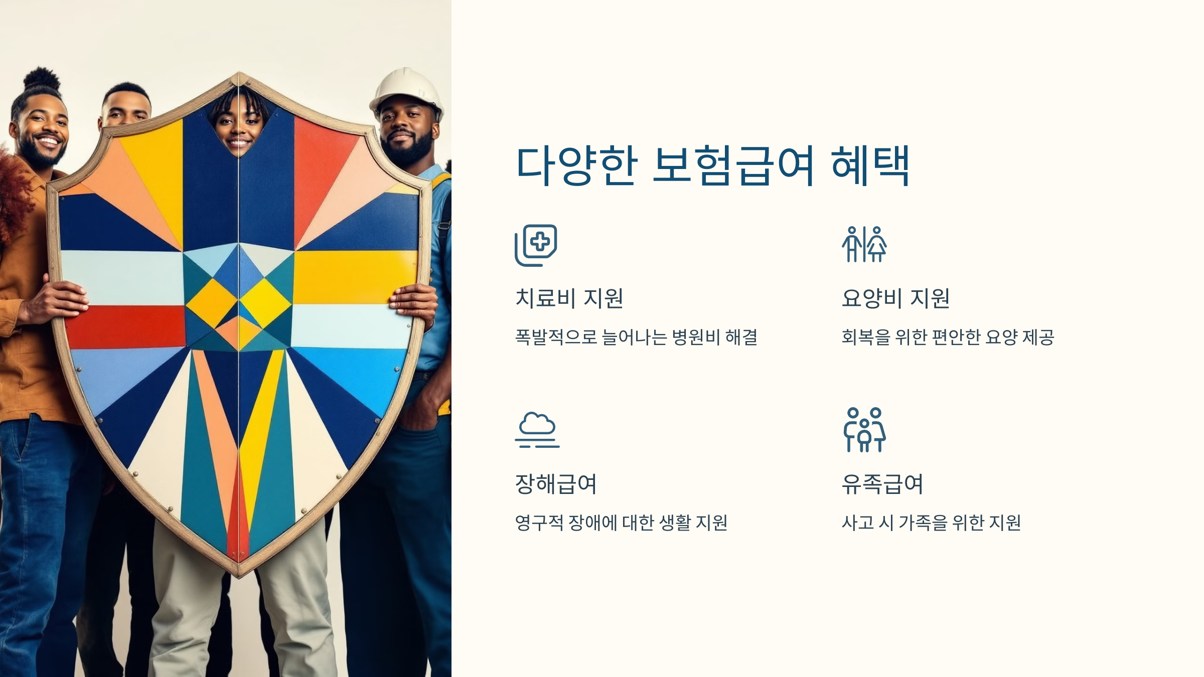 - 유족급여: 그리고 마지막으로 유족급여! 만약 여러분이 영웅이 되기 전에 사고로 세상을 떠나게 된다면, 그 가족을 지키기 위한 든든한 지원이 기다리고 있습니다. “아빠는 늘 곁에 있을 거야!”라는 마음으로 남겨진 이들을 지켜주세요.