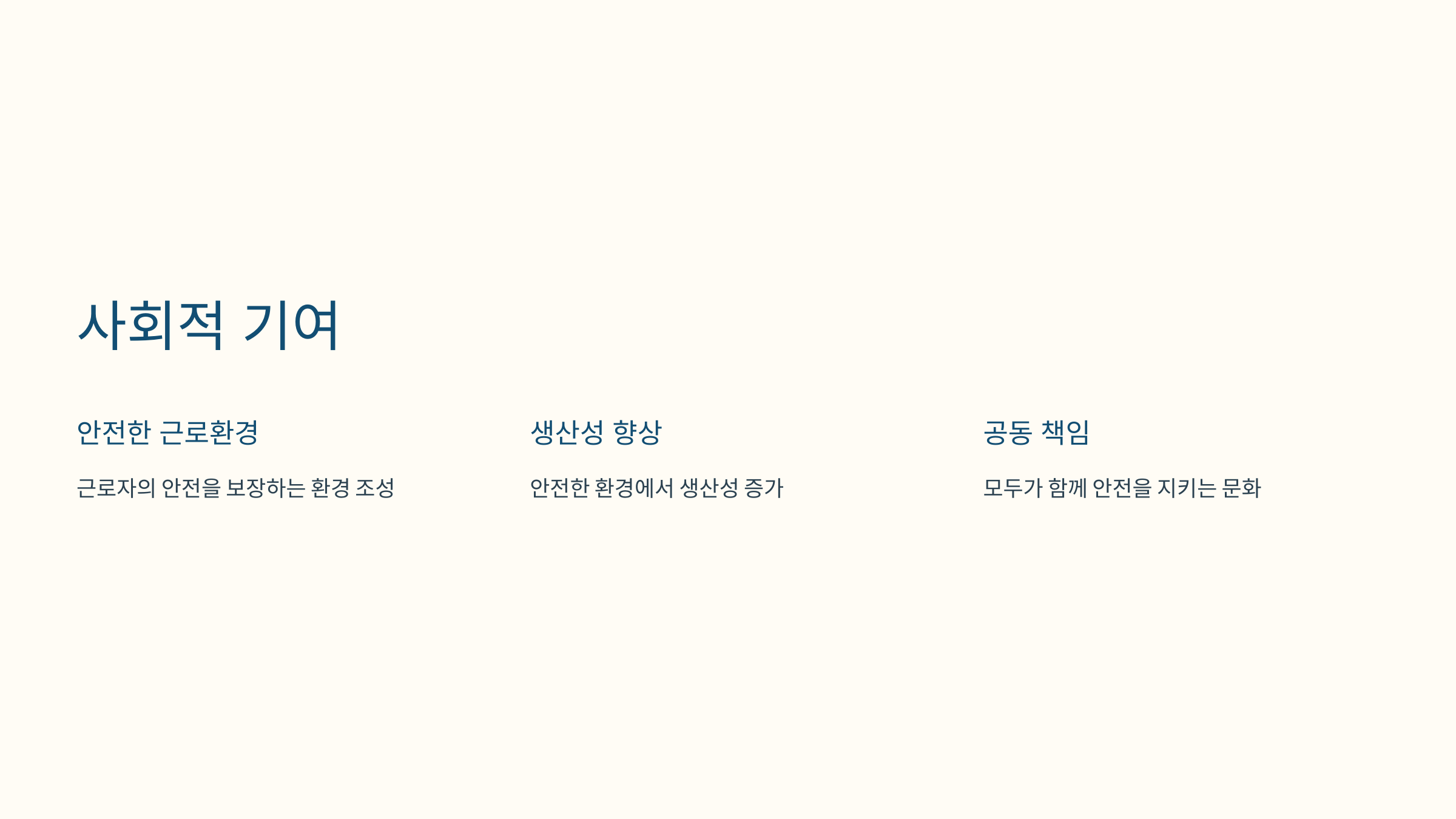 안전한 일터는 모두의 책임입니다. 함께 안전을 지키고, “오늘도 안전한 하루!”라고 외칠 수 있도록 만들어갑시다. 그러면 우리는 더 많은 일을 할 수 있고, 더 많은 웃음을 나눌 수 있을 거예요!
