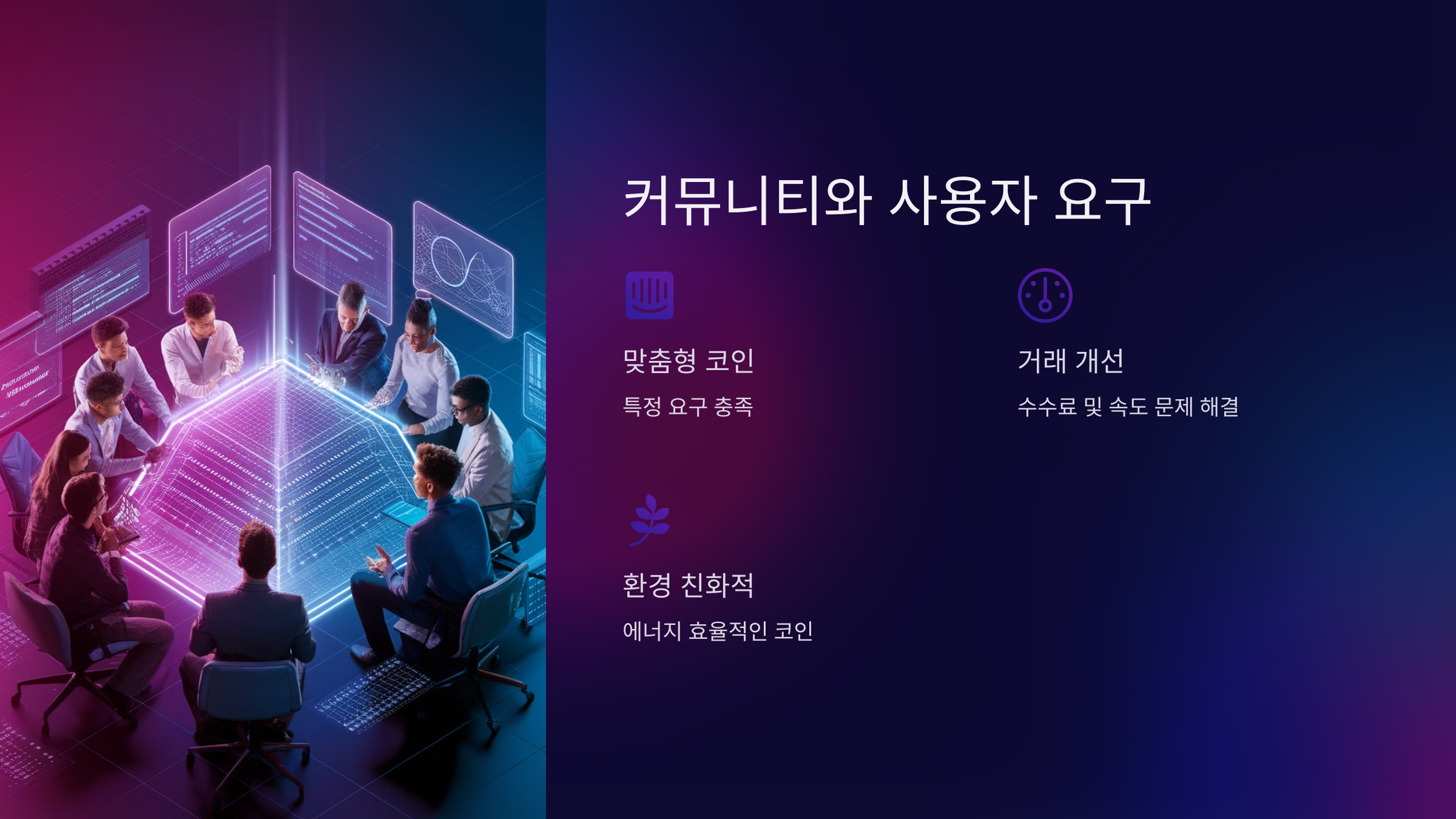 - 커스터마이징 가능성: 블록체인 커뮤니티는 특정 요구를 충족시키는 코인을 개발할 수 있습니다. 예를 들어, 에너지 효율적인 코인, 환경친화적인 코인, 특정 지역 사회를 위한 코인 등이 그 예입니다.