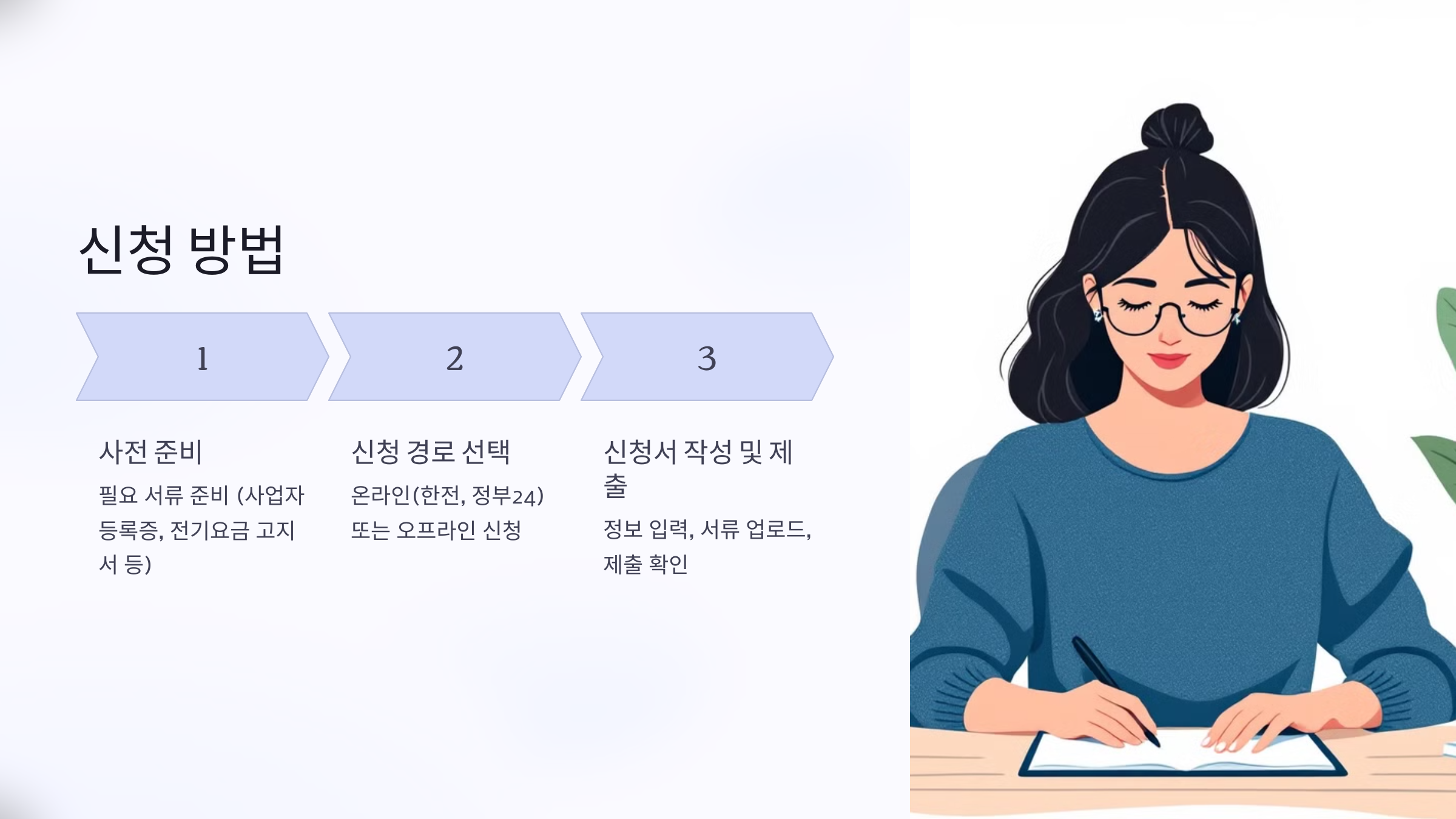 - 한국전력공사(Kepco) 또는 정부24 웹사이트를 통해 신청 가능.