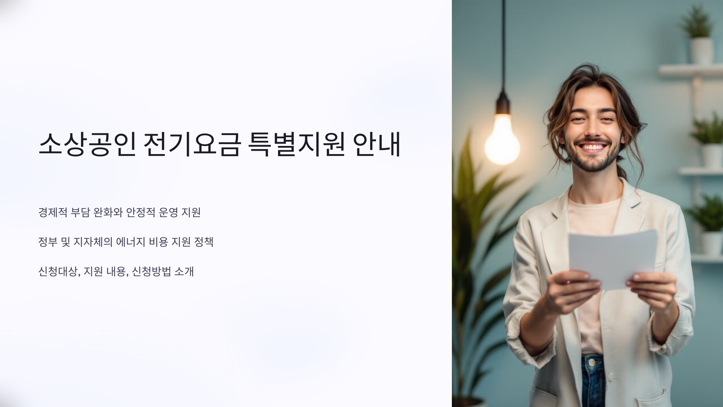 소상공인을 위한 전기요금 특별지원은 경제적 부담을 덜어드리기 위한, 경제적 안정을 돕기 위한 정부 및 지자체의 지원 정책입니다. 꾸준히 에너지 비용이 상승하며 운영에 어려움을 겪는 분들이 많으실 텐데요. 이를 돕기 위해 정부와 지자체가 전기요금 특별지원 제도를 마련했습니다. 이 제도는 전기요금 부담을 줄여드리고, 여러분의 소중한 사업장이 조금 더 안정적으로 운영될 수 있도록 돕는 데 목적이 있습니다. 지금부터 신청대상, 지원 내용, 신청방법등에 대해 알아보도록 하겠습니다.