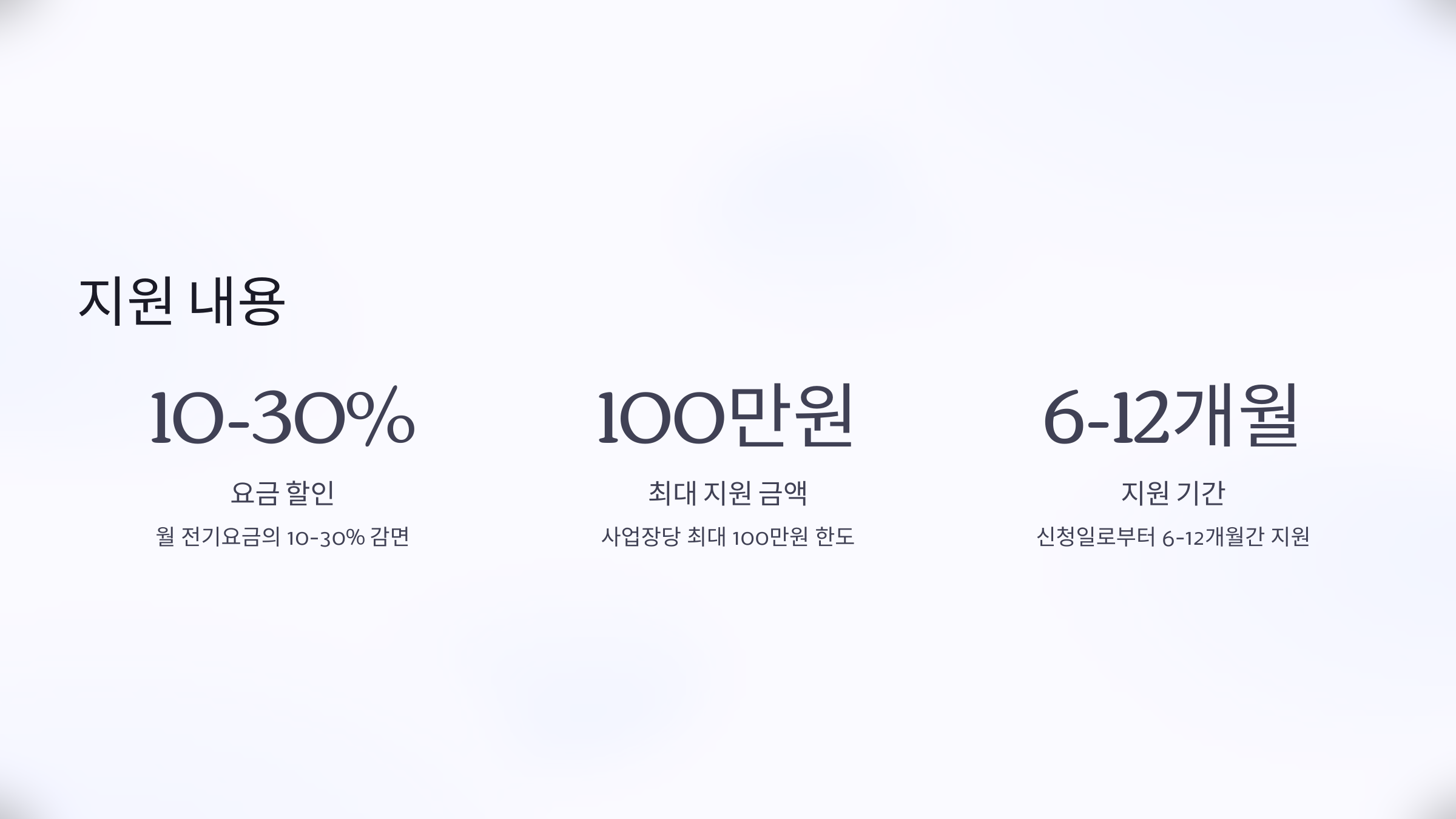 - 예: 전기요금이 월 80만 원 이상인 사업장은 최대 100만 원까지 지원 가능.
