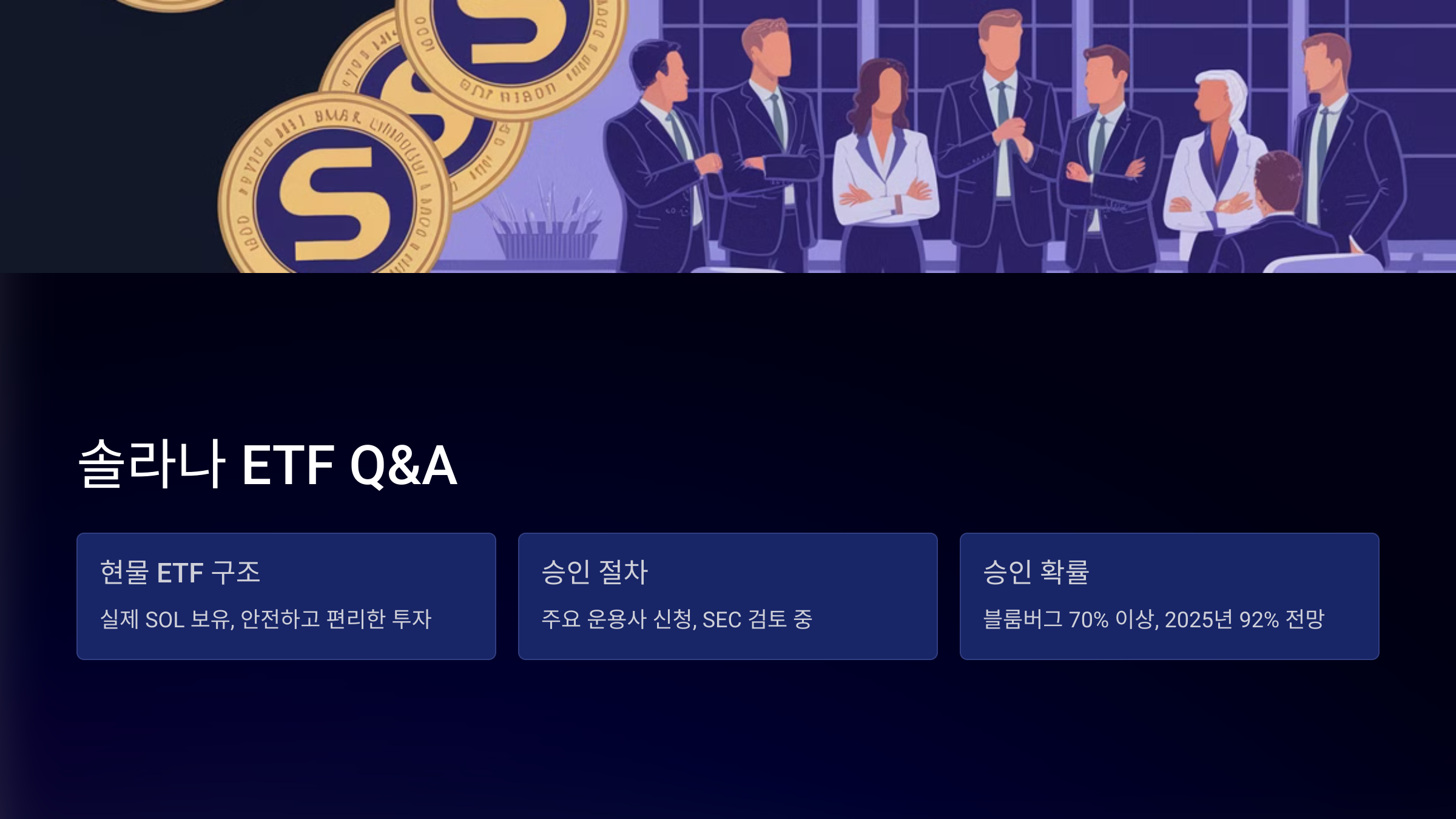 현물 ETF는 파생상품이 아니라 실제 SOL을 보유하고 거래하는 구조이기 때문에, 투자자들은 암호화폐 시장 변동성의 영향을 받으면서도 더 안전하고 편리한 방식으로 솔라나에 투자할 수 있습니다.