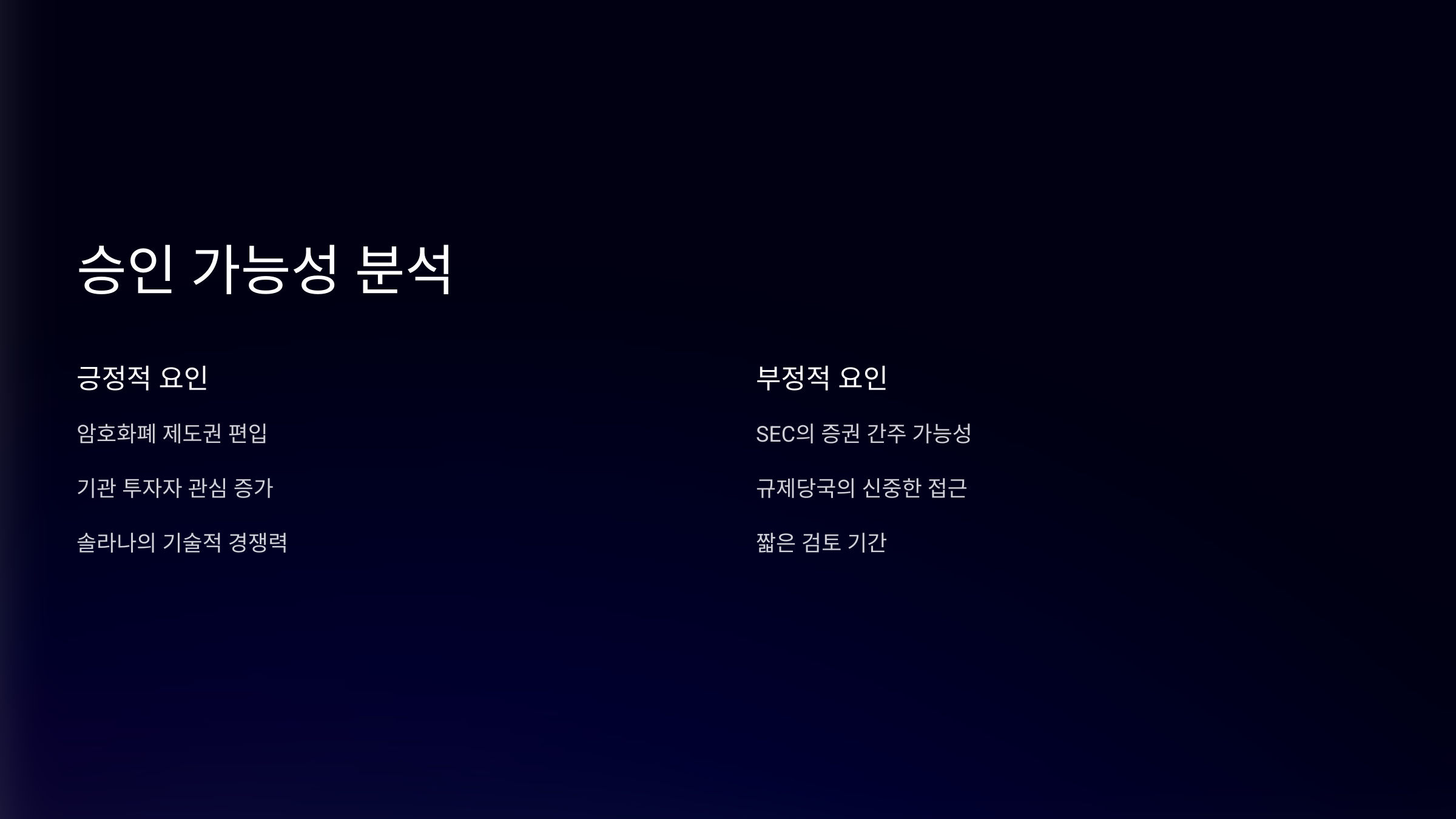 - 비트코인과 이더리움 ETF 승인 후 가격이 급등한 사례처럼, 솔라나도 기관 자금 유입으로 인해 가격 상승이 기대됨
