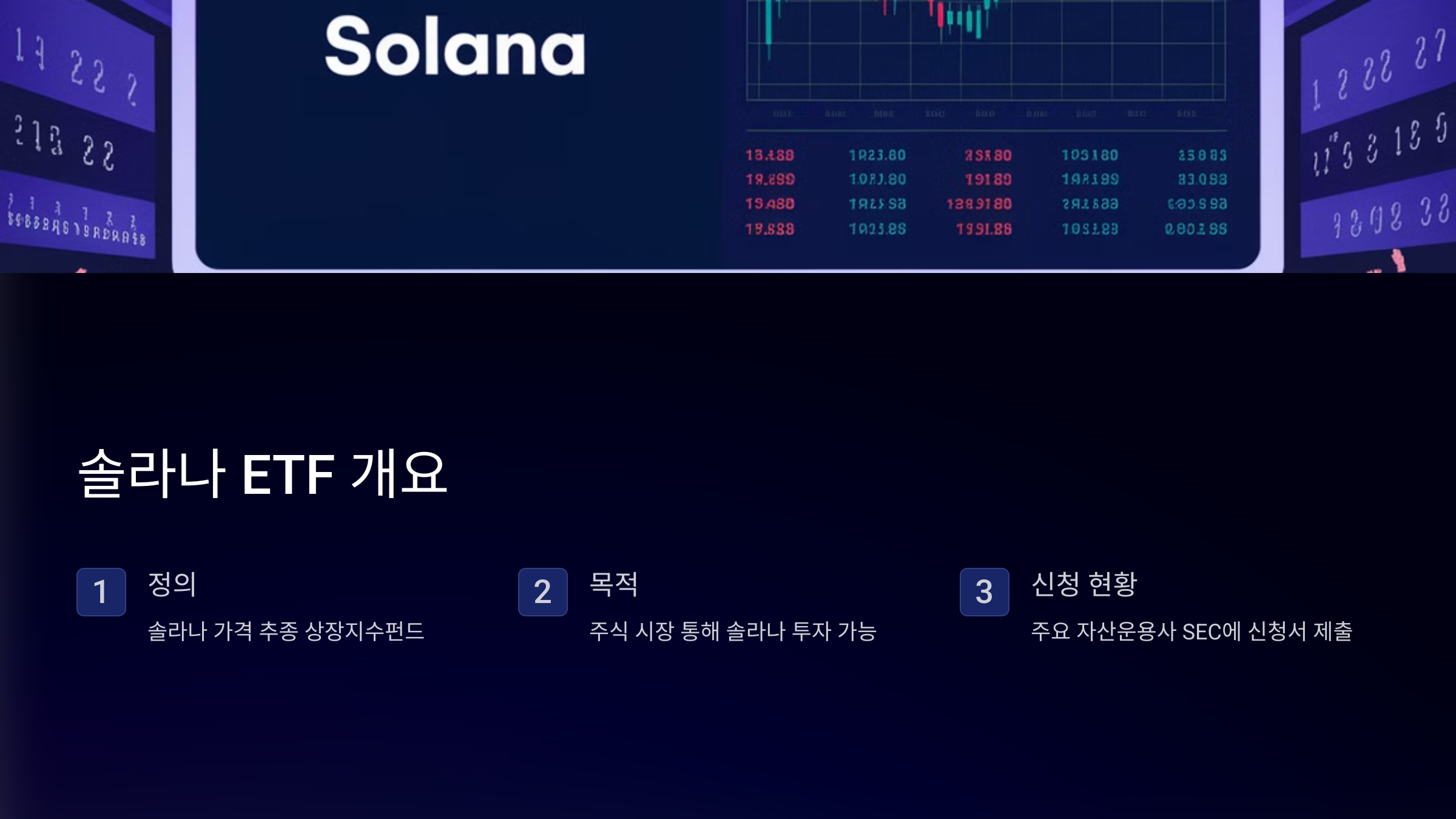 솔라나 ETF는 **솔라나(SOL)의 가격을 추종하는 상장지수펀드(ETF)**로, 투자자들이 암호화폐 거래소를 이용하지 않고도 주식 시장을 통해 솔라나에 투자할 수 있도록 설계된 금융 상품입니다.