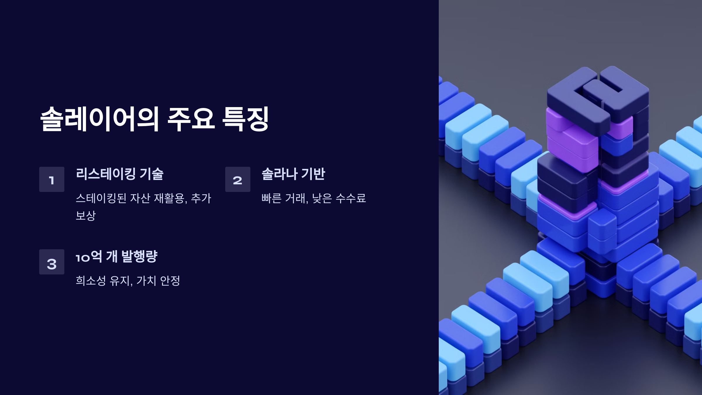솔레이어는 2025년 1월 출시된 암호화폐로, 솔라나 블록체인을 활용하여 리스테이킹 기술을 기반으로 한 스테이킹 확장성을 제공합니다. 기존의 스테이킹 모델은 자산을 일정 기간 예치하고 보상을 받는 방식이었지만, 솔레이어는 이러한 모델을 개선하여 스테이킹 자산을 한 번 더 활용할 수 있도록 설계되었습니다.