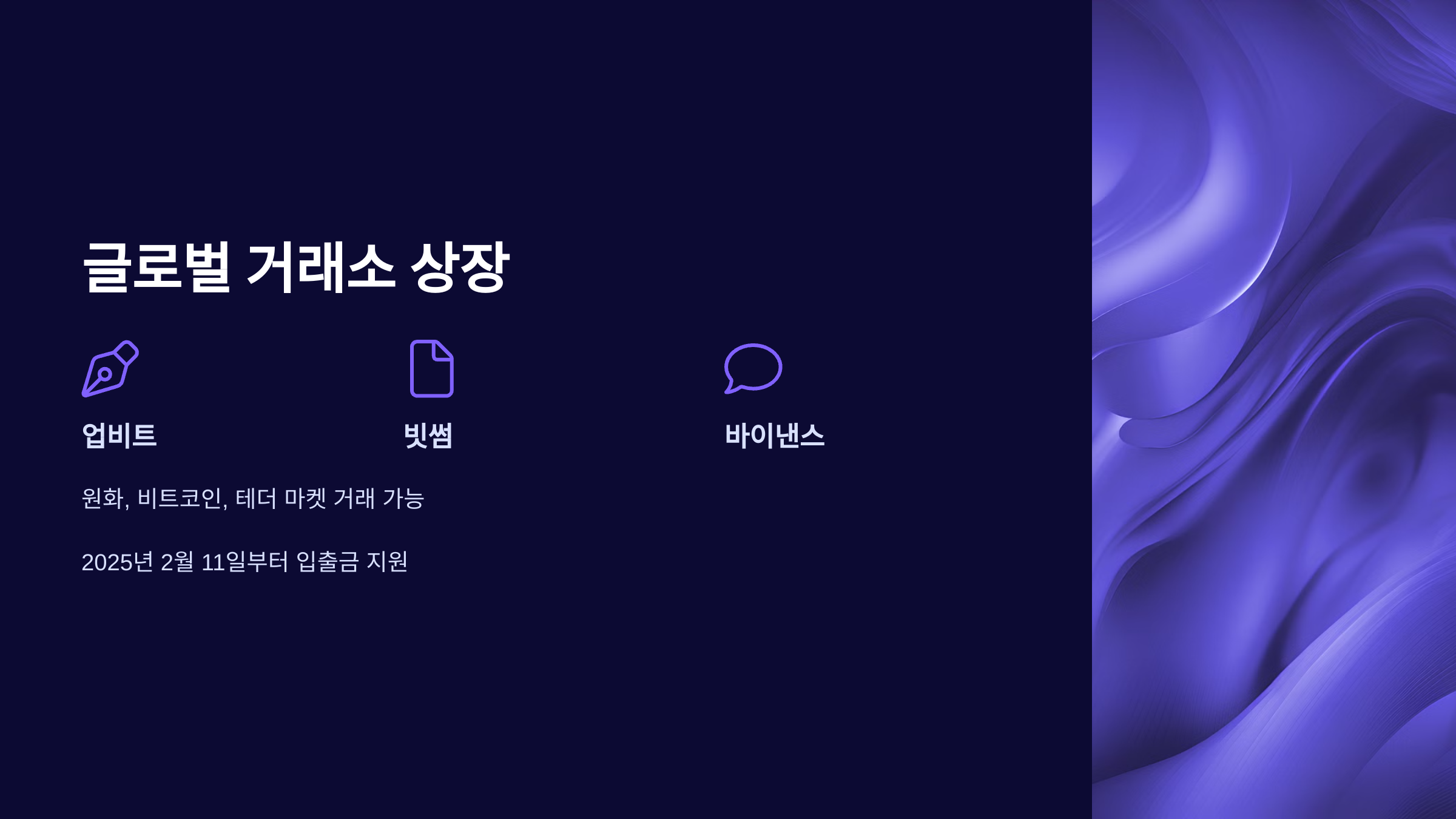 - 업비트, 빗썸, 바이낸스에서 원화(KRW), 비트코인(BTC), 테더(USDT) 마켓 거래 가능