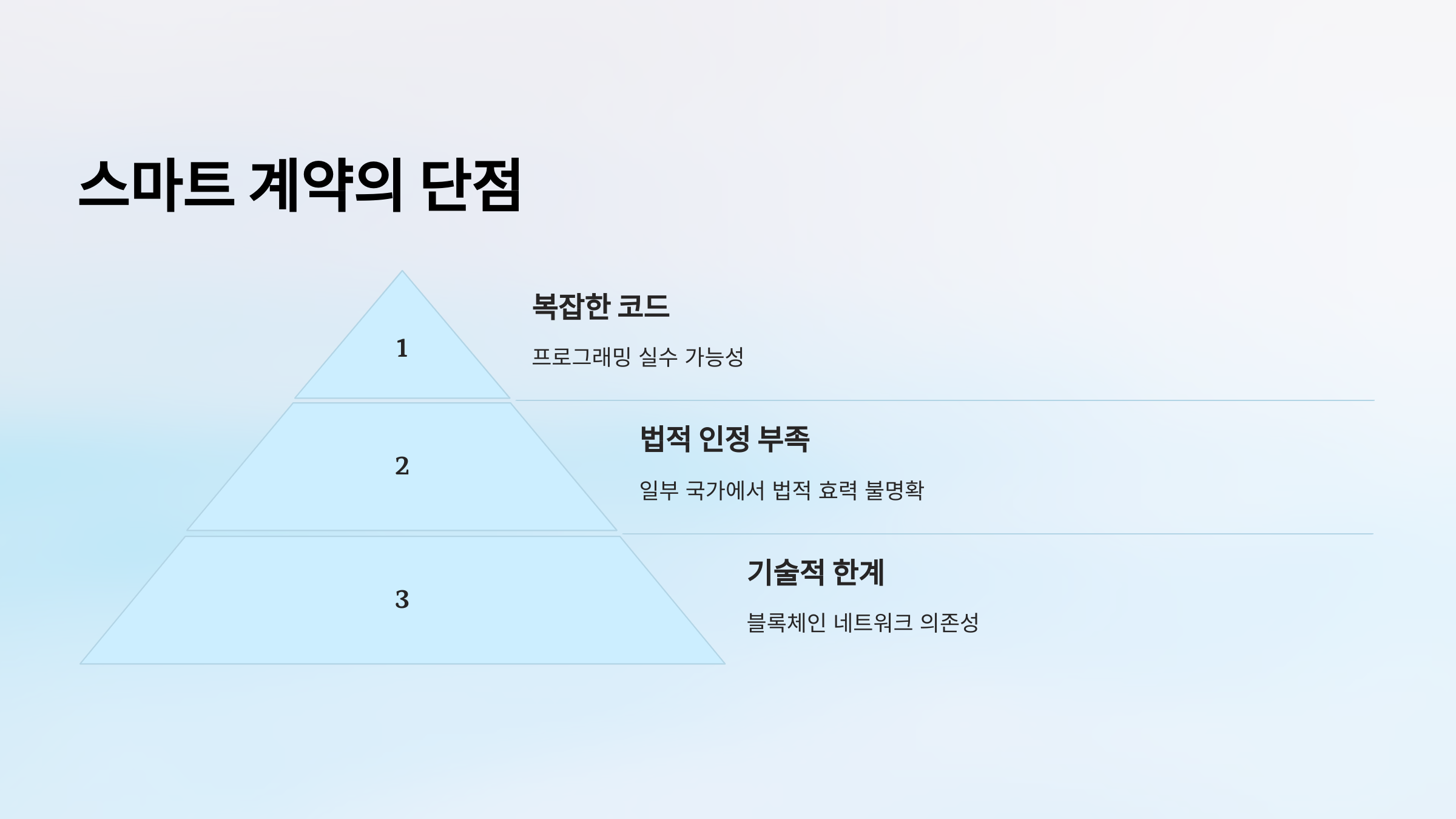 - 기술적 한계: 스마트 계약이 실행되기 위해서는 블록체인 기술이 완벽하게 작동해야 하므로, 네트워크에 의존적입니다.