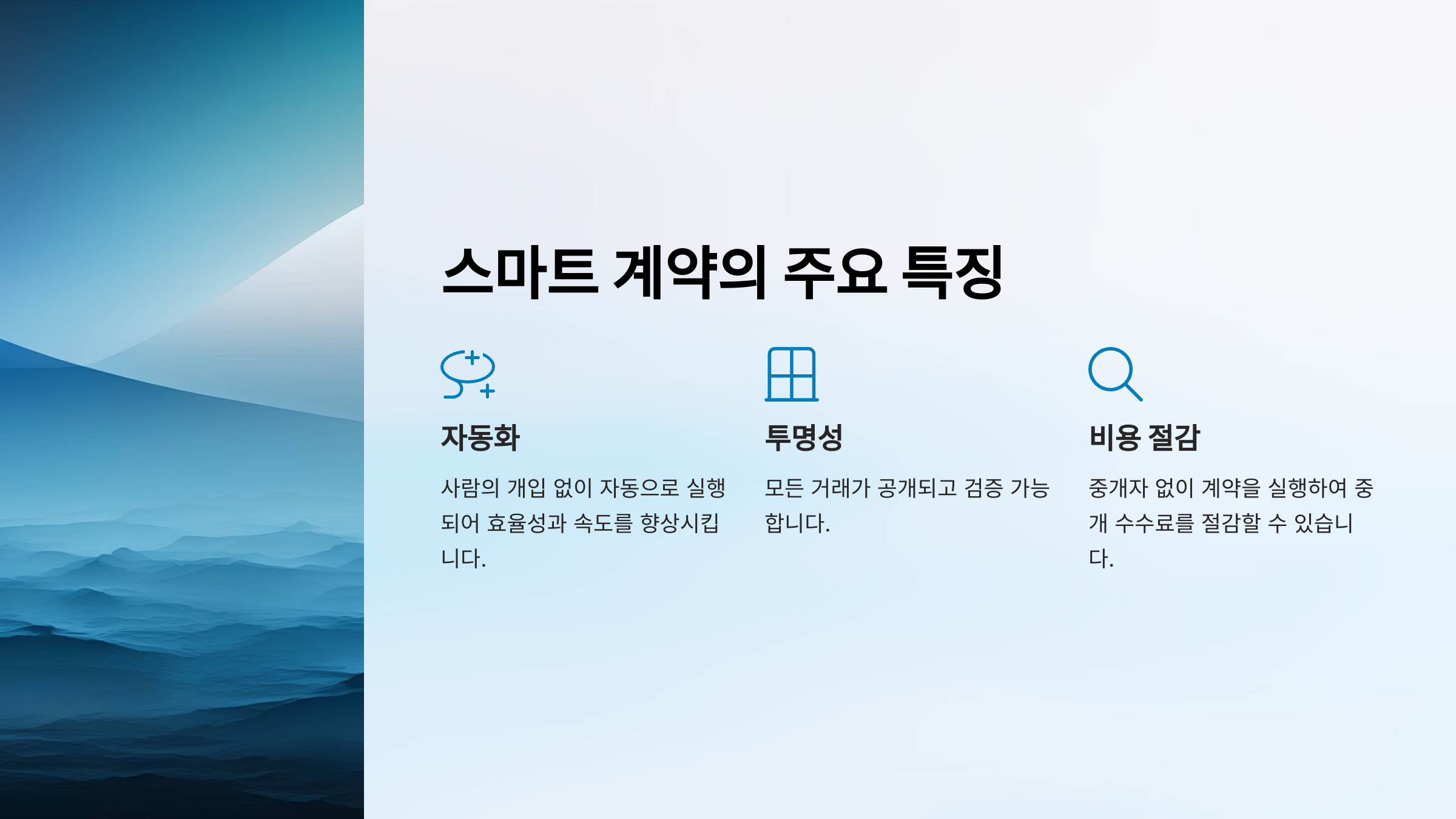 - 자동화: 스마트 계약은 사람이 개입할 필요 없이 자동으로 실행됩니다. 이는 효율성과 속도를 크게 향상시킵니다.