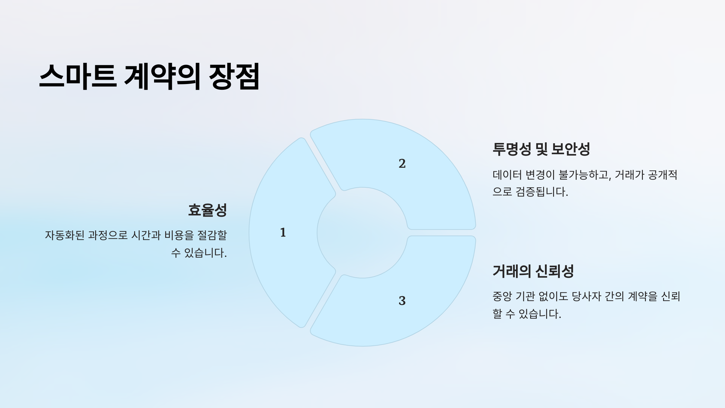 - 거래의 신뢰성: 중앙 기관 없이도 당사자 간의 계약을 신뢰할 수 있습니다.