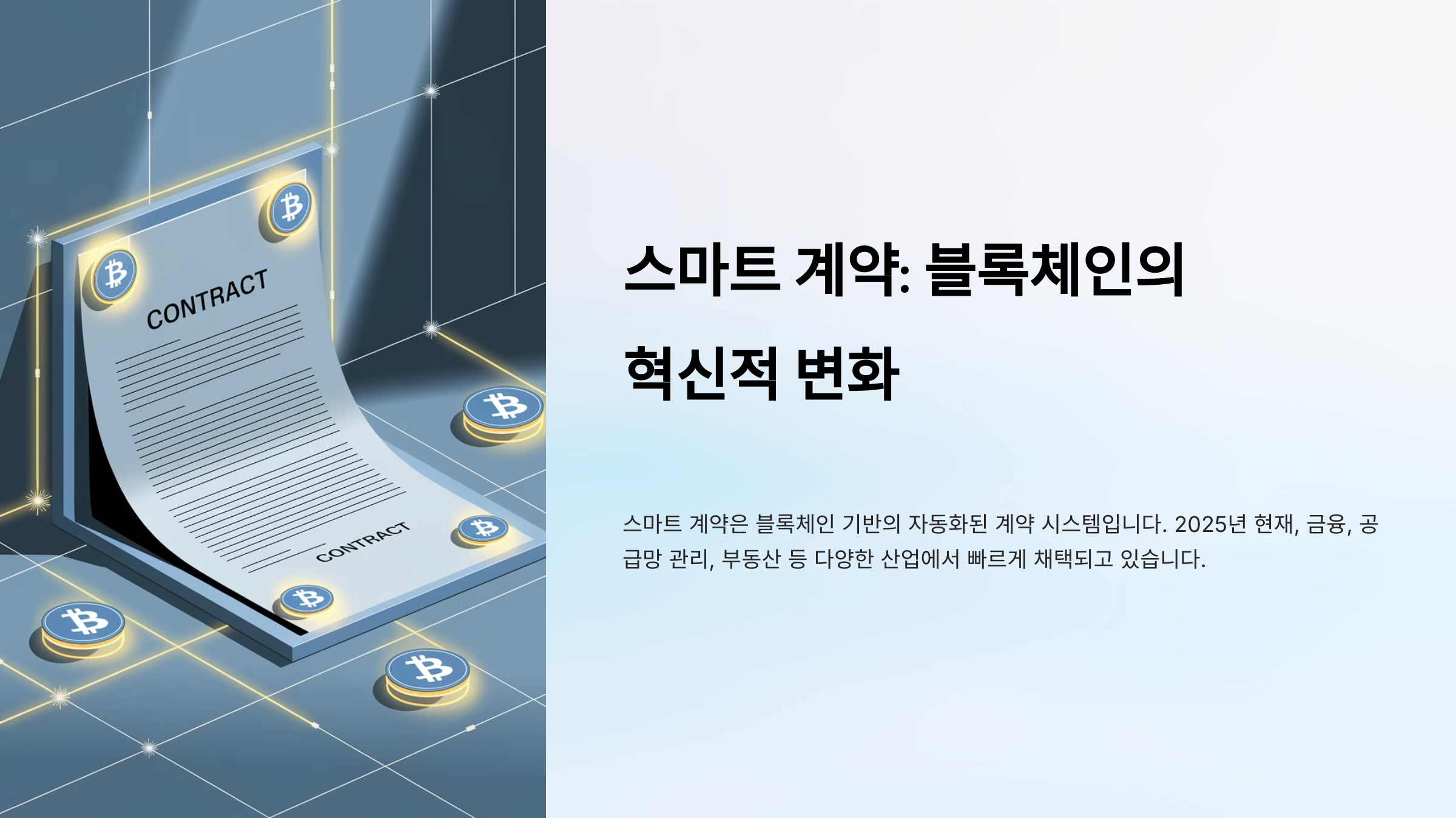 스마트 계약(Smart Contract)은 블록체인 기술을 기반으로 하는 자동화된 계약 시스템입니다. 전통적인 계약은 두 당사자 간에 서면으로 체결되고, 그 이행을 위해 제3자가 필요할 수 있지만, 스마트 계약은 이러한 과정을 디지털화하고 자동화합니다. 2025년 현재, 스마트 계약은 금융, 공급망 관리, 부동산 등 다양한 산업에서 빠르게 채택되고 있습니다.