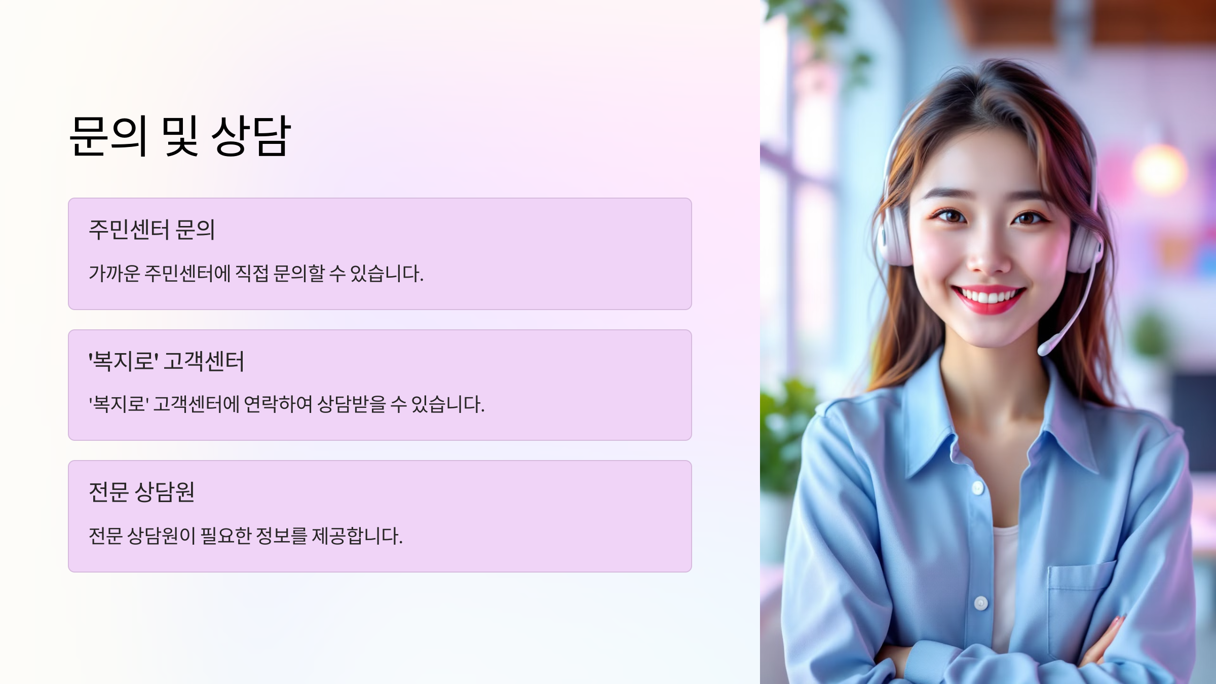 아동수당 지급 신청 과정에서 궁금한 점이나 도움이 필요할 경우, 가까운 주민센터에 문의하거나 ‘복지로’ 고객센터에 연락할 수 있습니다. 전문 상담원이 필요한 정보를 제공하고 도와줄 것입니다.