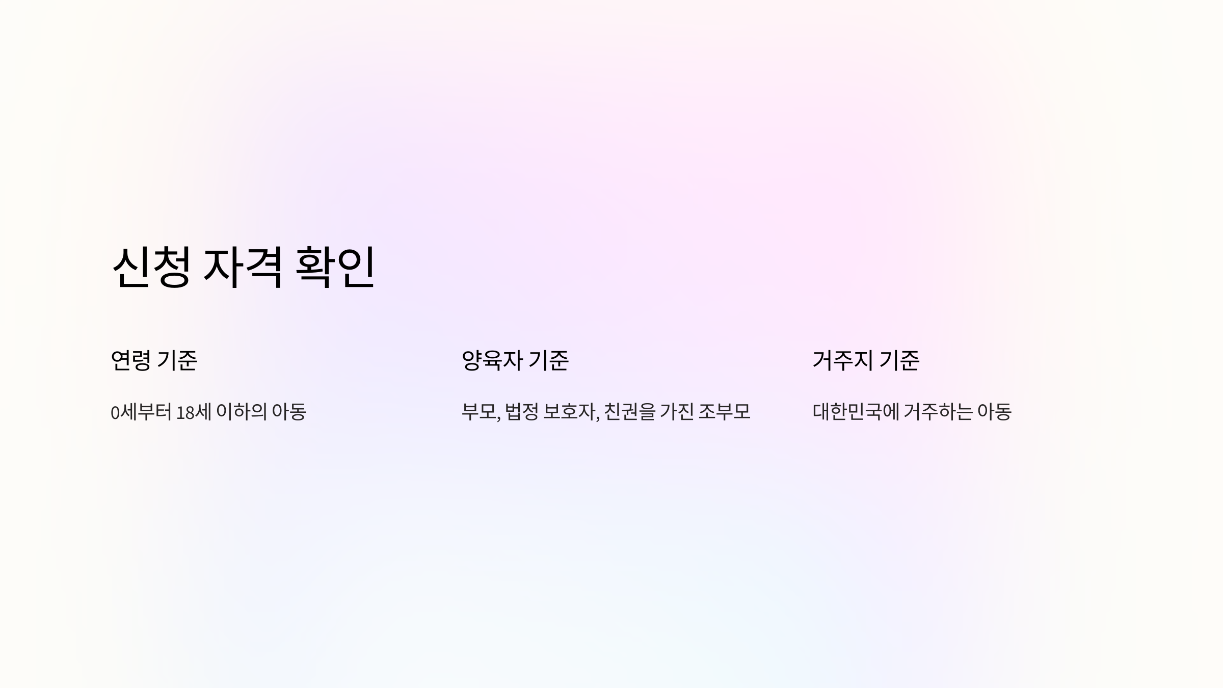 - 양육자 기준: 아동수당 지급은 아동을 양육하는 부모님 또는 법정 보호자가 신청할 수 있습니다. 생물학적 부모뿐만 아니라 입양 부모, 친권을 가진 조부모도 포함됩니다.