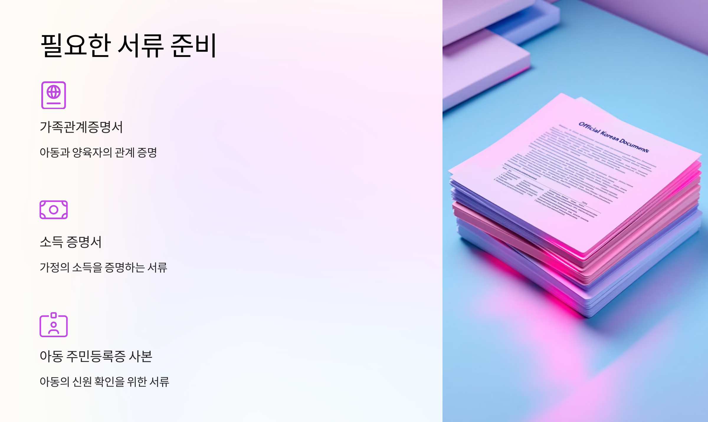 - 가족관계증명서: 아동과 양육자의 관계를 증명하는 서류로, 주민센터에서 발급받을 수 있습니다.
