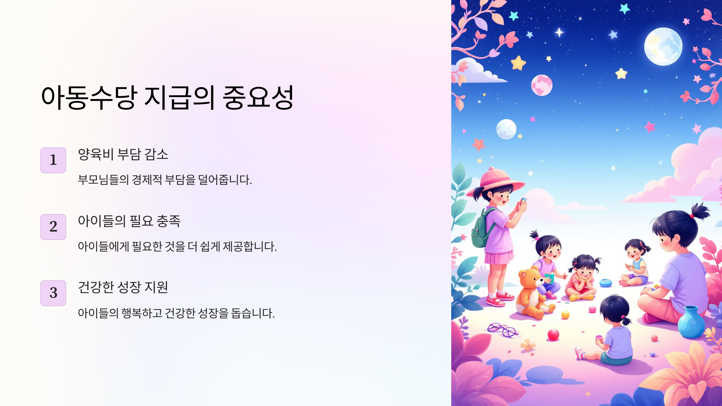 아동수당 지급은 아이들과 그 가정을 지원하기 위해 마련된 제도입니다.