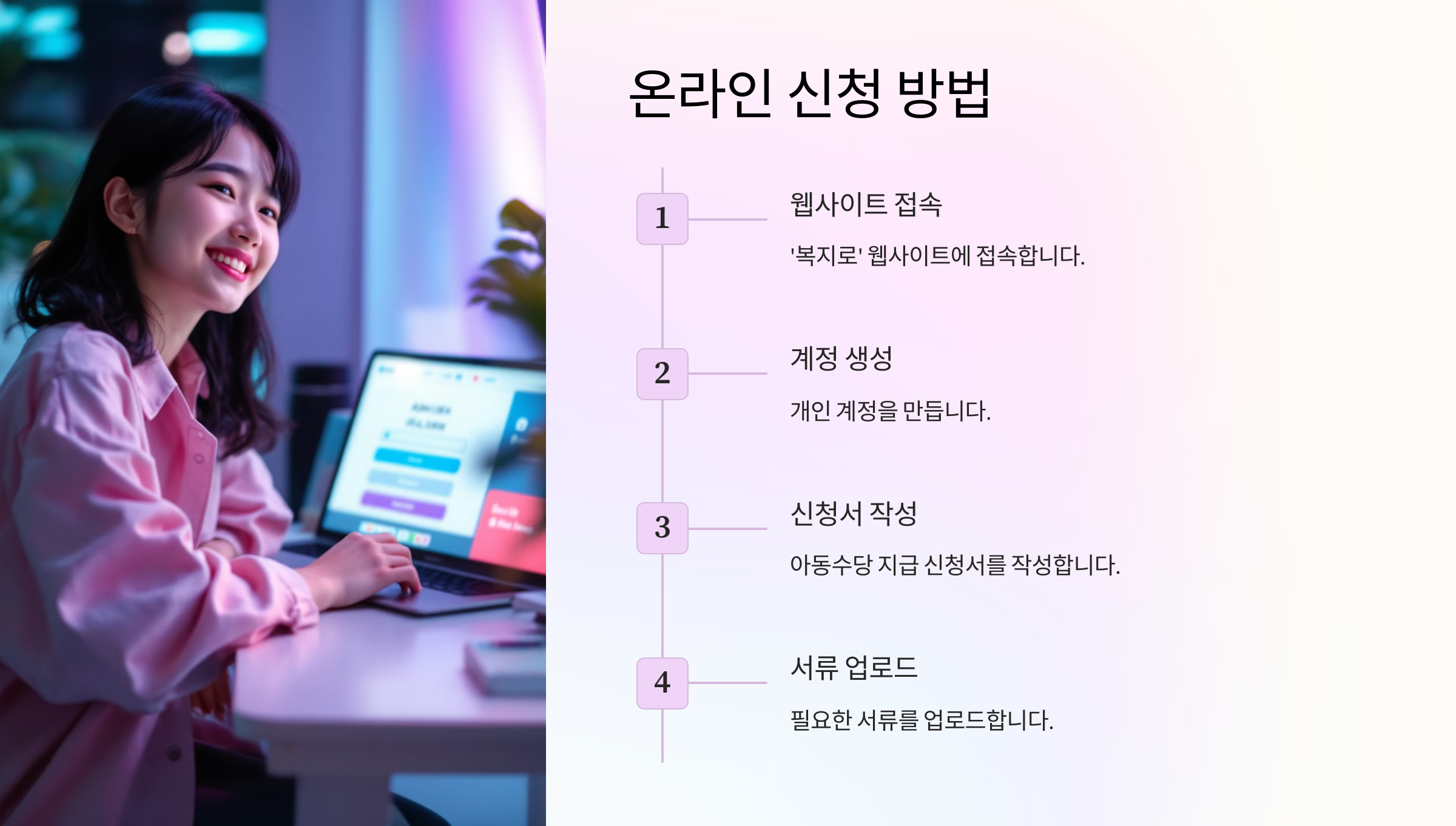 - 온라인 신청: ‘복지로’ 웹사이트에 접속하여 계정을 만든 후, 아동수당 지급 신청서를 작성하고 필요한 서류를 업로드합니다. 온라인 신청은 매우 간편하고 시간을 절약할 수 있는 방법입니다.