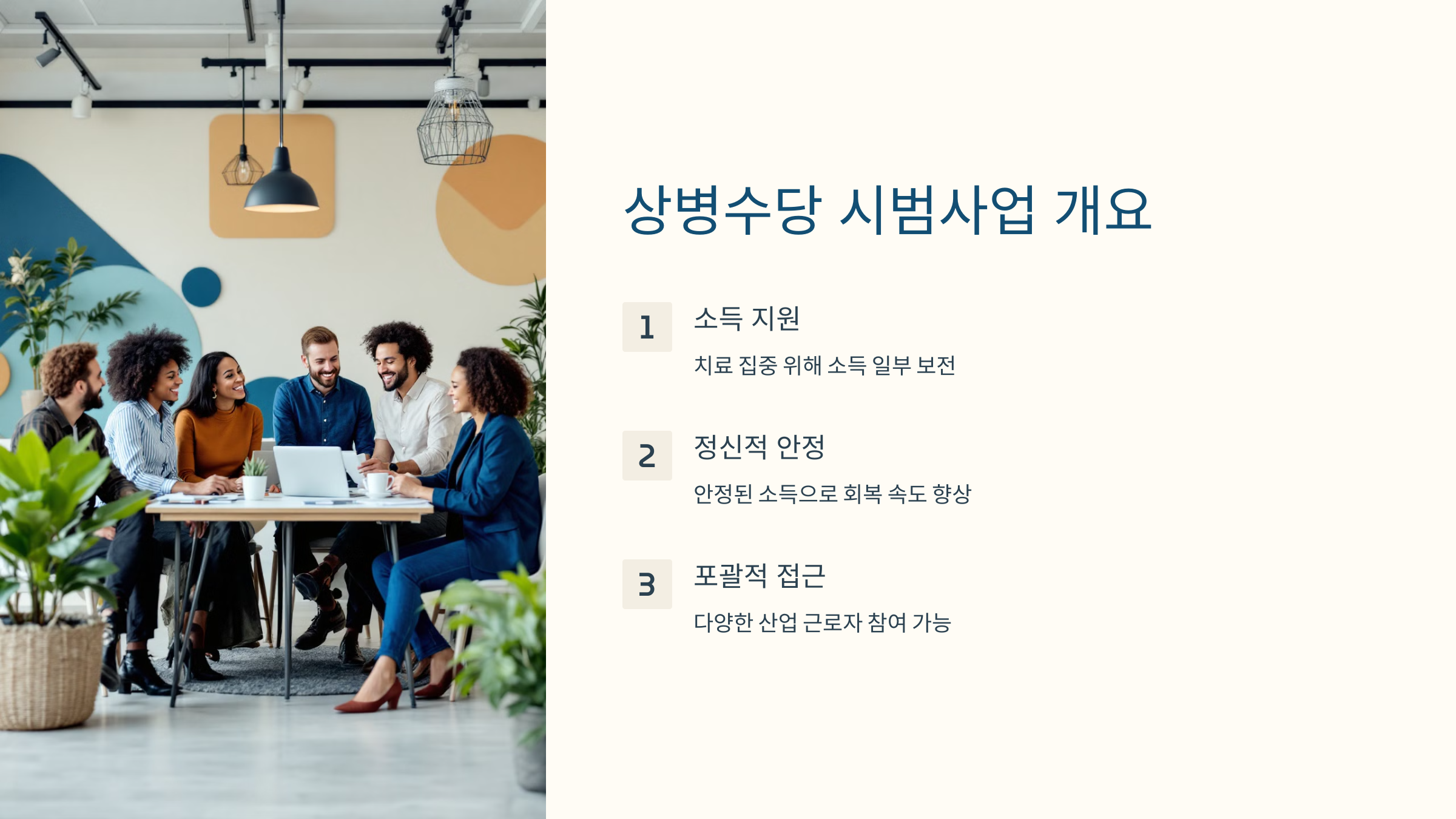 안녕하세요! 오늘은 상병수당 시범사업에 대해 자세히 알아보려 합니다. 이 사업은 아프거나 부상을 당했을 때 소득 손실을 보전받을 수 있도록 지원하는 제도입니다. 여러 이유로 일할 수 없는 분들에게 경제적 안정을 제공하여, 건강 회복에 집중할 수 있는 환경을 마련하는 것이 목적입니다. 아래에서 상병수당 시범사업의 주요 내용과 지원받는 방법에 대해 구체적으로 설명드릴게요.