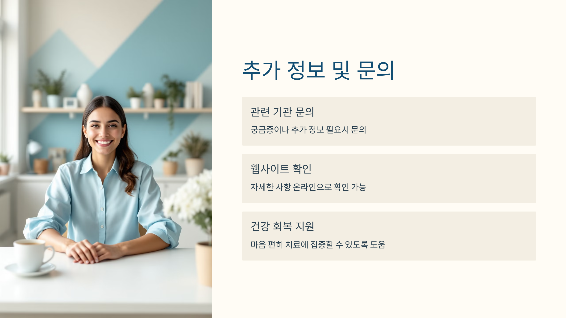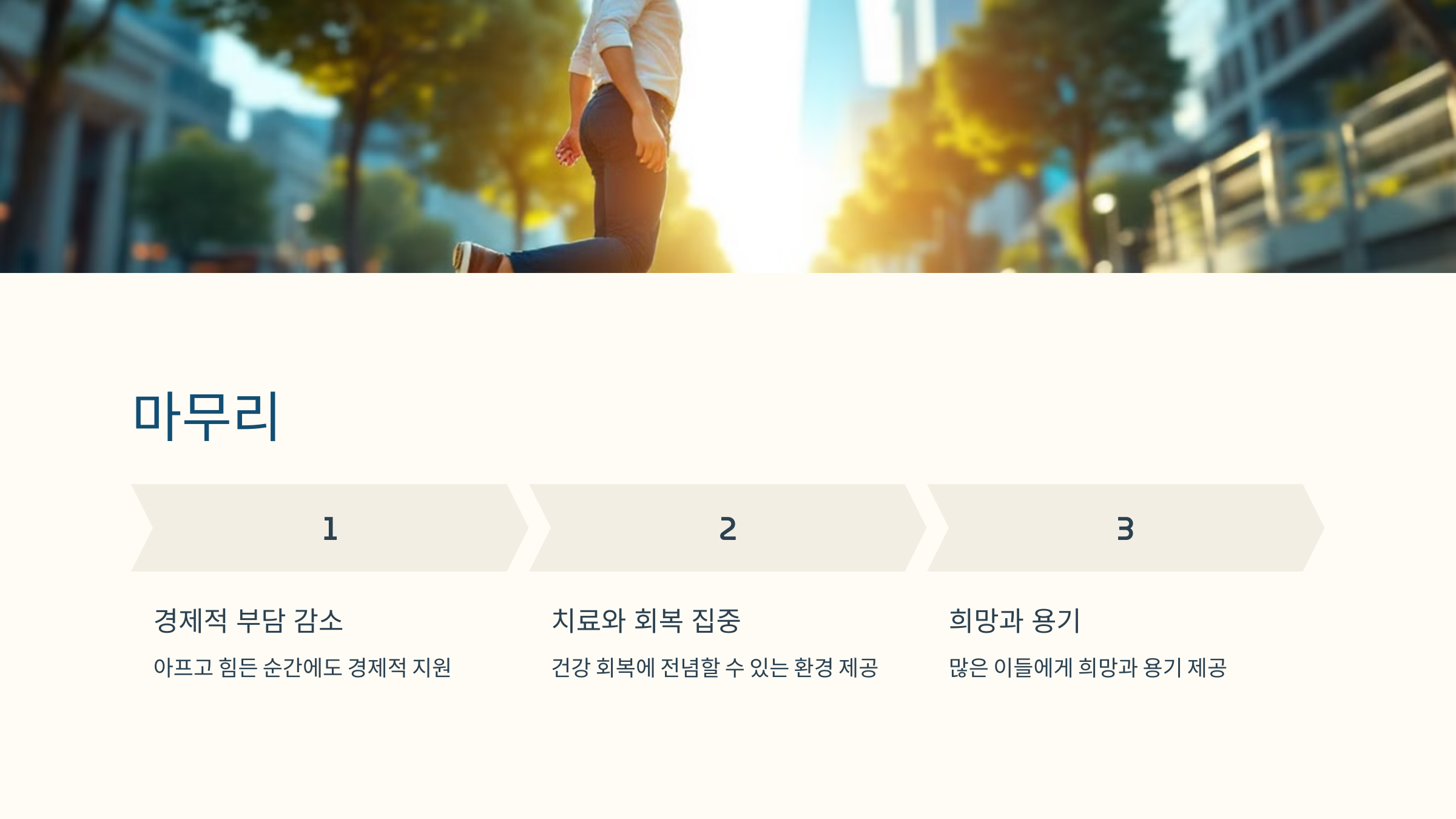 - 정신적 안정: 안정된 소득 지원으로 인해, 치료와 회복에 전념할 수 있는 환경이 조성됩니다. 이는 정서적 안정을 가져오고, 회복 속도를 높일 수 있습니다.