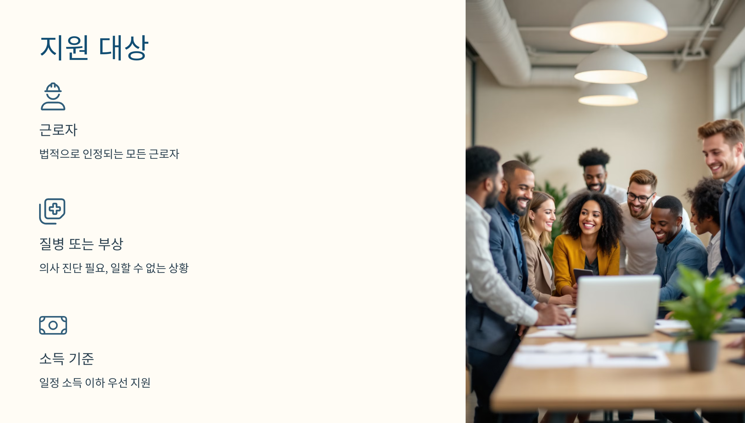 - 소득 기준: 일정 소득 이하의 근로자들이 우선 지원 대상이 됩니다.