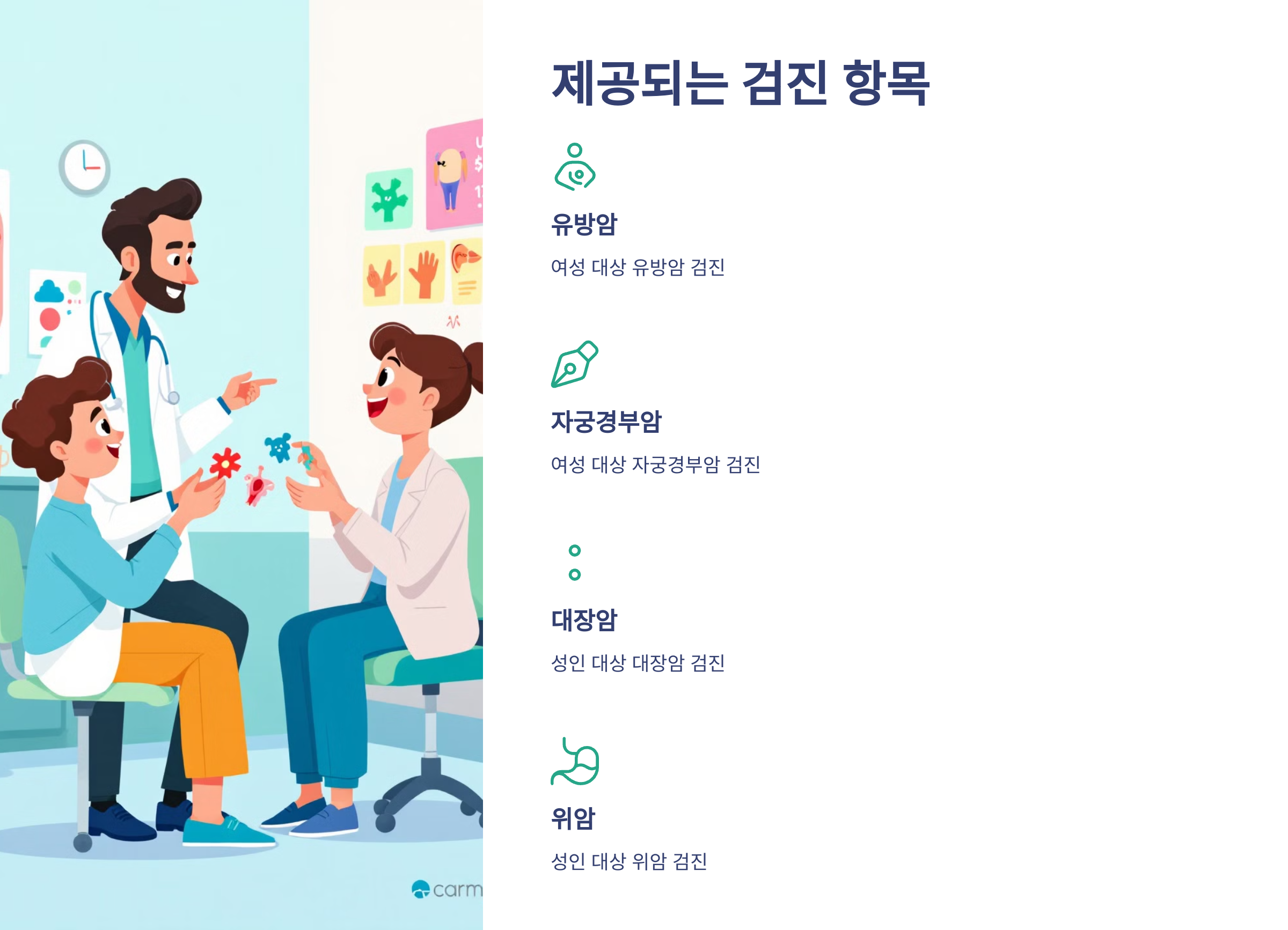 암건진사업에서는 유방암, 자궁경부암, 대장암, 위암, 폐암 등 다양한 종류의 암에 대한 검진을 실시합니다. 각 검진 항목은 연령대와 성별에 따라 맞춤형으로 제공되며, 정기적인 검진을 통해 조기 발견의 기회를 증대시킵니다. 검진 결과에 따라 전문의의 상담 및 추가 검사가 이루어지며, 이를 통해 효과적인 치료로 이어질 수 있도록 합니다.