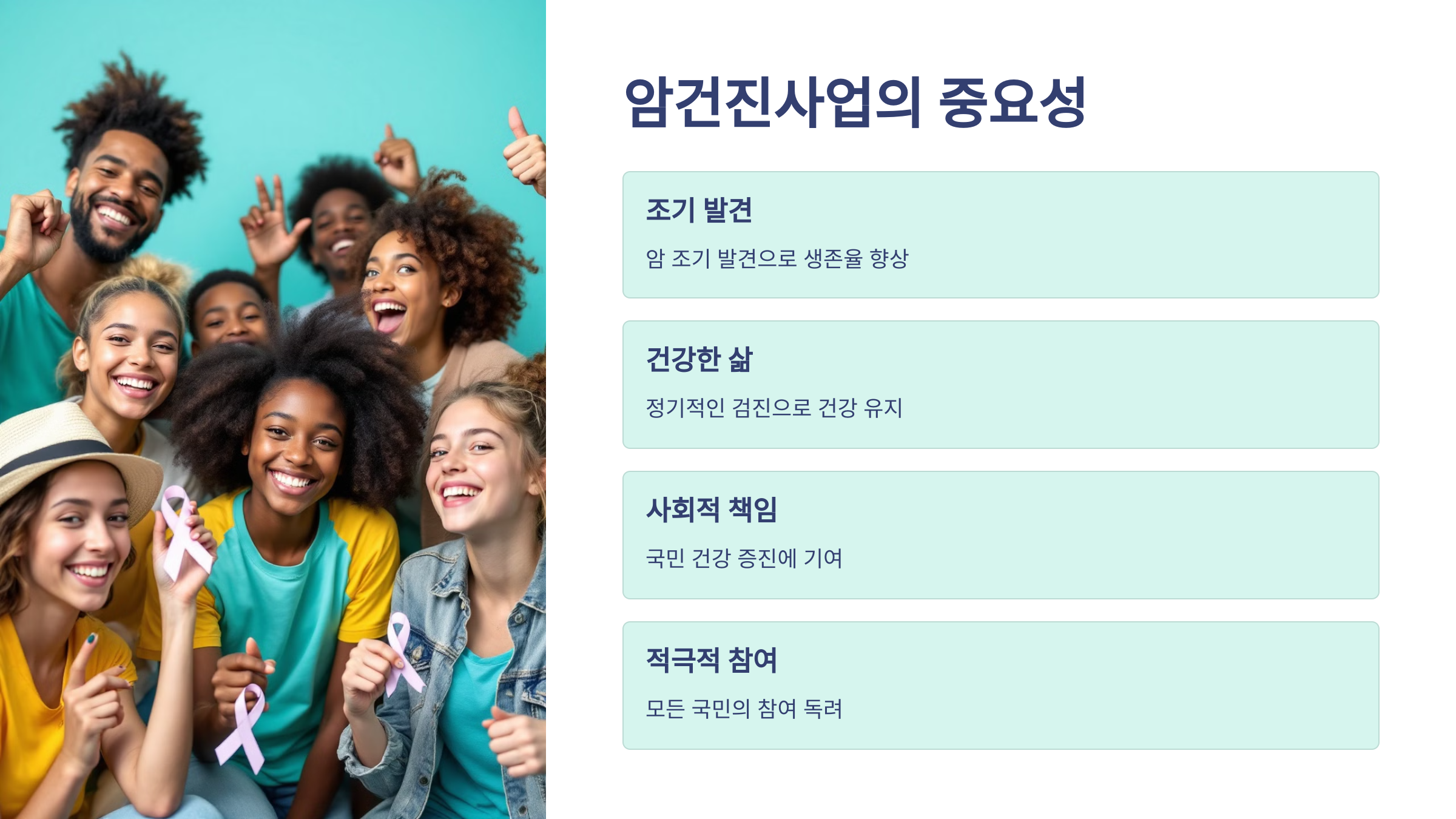 암건진사업은 건강한 미래를 위해 모든 국민이 적극적으로 참여해야 하는 필수 프로그램입니다. 조기 검진을 통해 암을 예방하고, 건강한 삶을 영위하는 데 필요한 첫걸음을 내딛는 것이 중요합니다. 암건진사업에 많은 참여를 통해 개인의 건강을 유지하고, 건강한 사회를 구축해 나가기를 바랍니다.