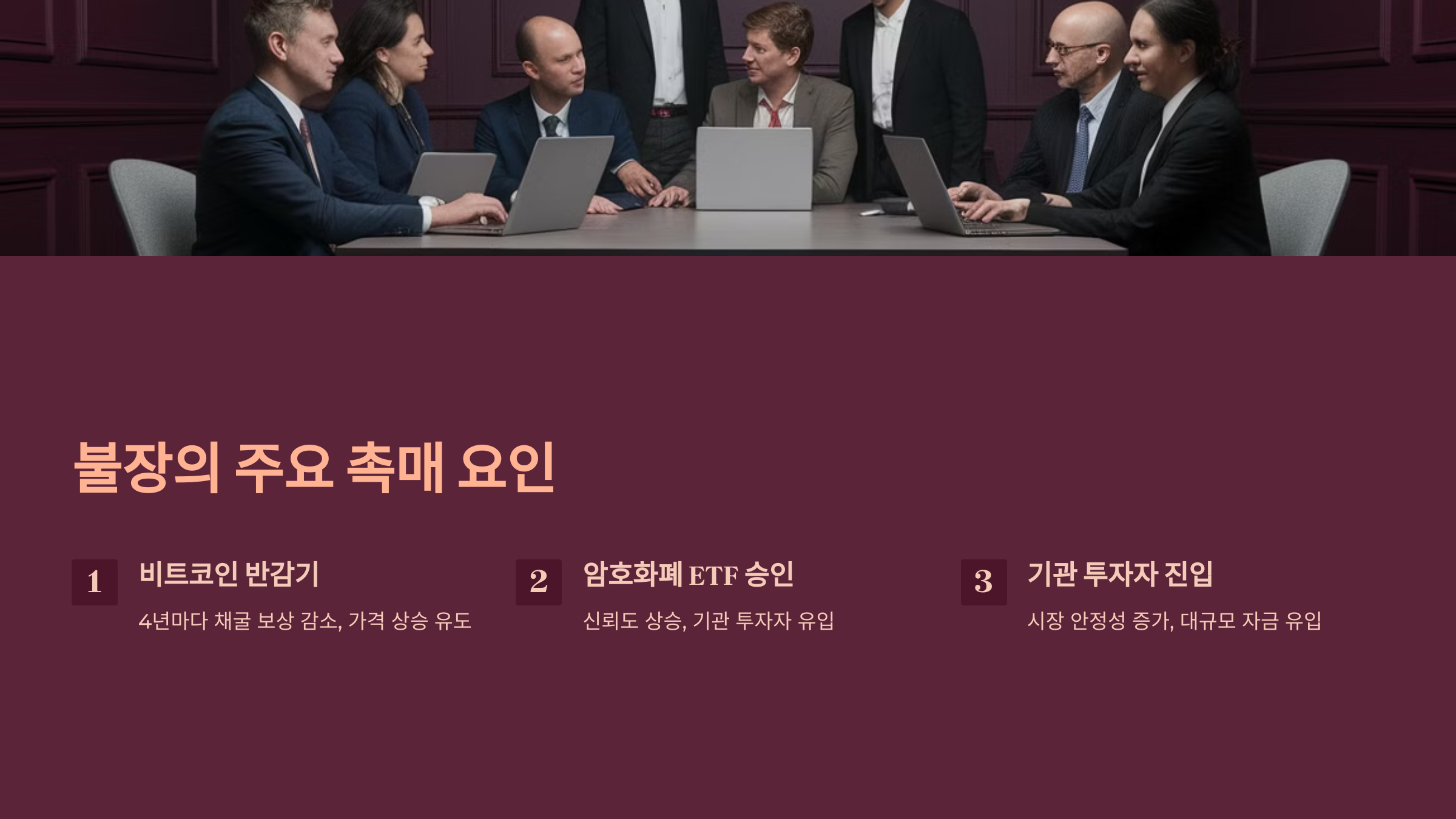비트코인의 반감기는 대체로 불장을 촉발하는 중요한 요소입니다. 비트코인은 약 4년마다 채굴 보상이 절반으로 줄어들면서 공급이 제한되고, 이는 가격 상승의 원동력이 됩니다. 과거 데이터를 보면 반감기 이후 1~1.5년 내에 불장이 발생하는 경향이 강했습니다.