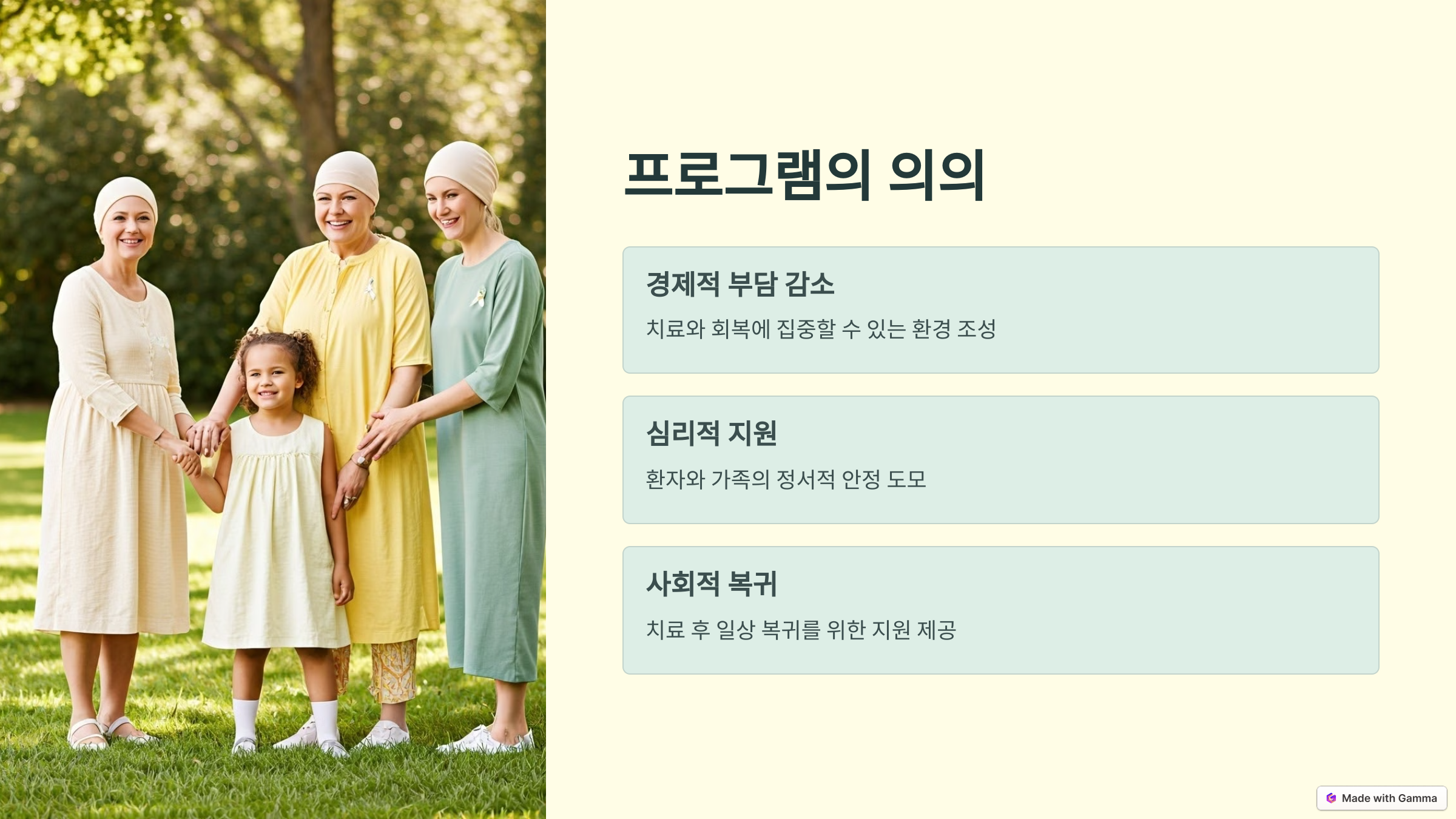 암환자 의료비 지원은 경제적 여유가 부족한 가정의 암 환자, 특히 소아 및 아동 암환자에게 의료비를 지원하여 경제적 부담을 덜어주는 복지 서비스입니다. 암환자들은 신체적, 정서적, 경제적 어려움을 겪으며, 이는 치료 효과에도 영향을 미칠 수 있습니다. 의료비 지원을 통해 환자들이 경제적 부담을 줄이고 더 나은 치료를 받을 수 있도록 돕는 것이 이 프로그램의 목표입니다.